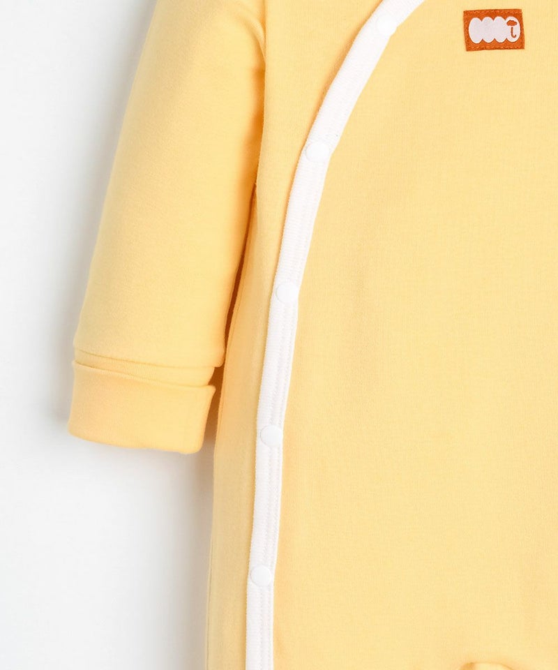 柔らかい肌ざわりで伸縮性に優れたモダールコットンカバーオール。フロントのワッペンがポイント♪出産のお祝いなどにもおすすめのアイテムです。