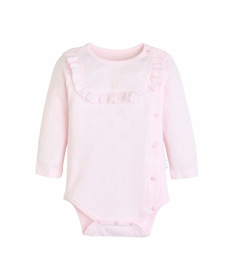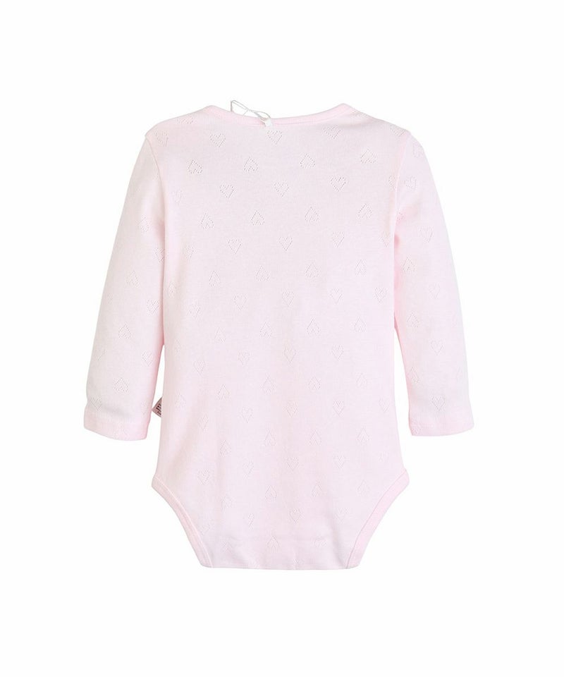 ハートのアイレット生地のボディースーツ型の長袖ロンパースとリボンヘアバンドのセット。フロントは胸元のハートのワンポイントとフリルでラブリーな印象に。フロントから股下までスナップボタンで大きく開くのでオムツ替えやお着替えも簡単。出産祝いなどのギフトにもおすすめです。mini moiとは・・・新生児のための新しいmoimolnのオリジナルシリーズ。