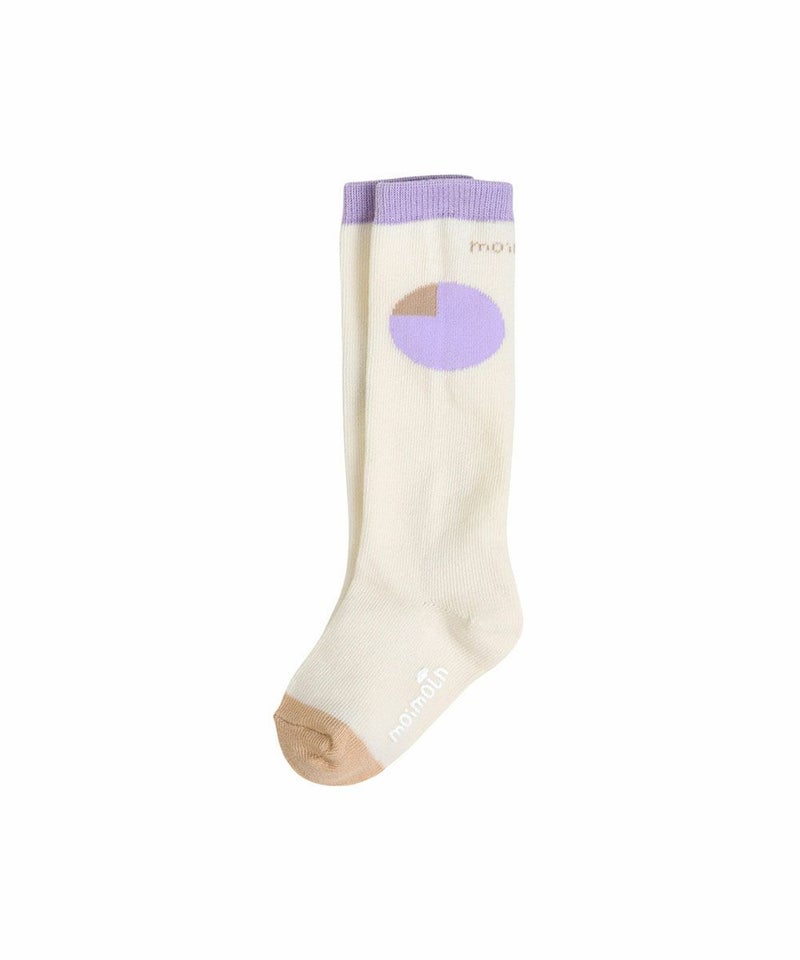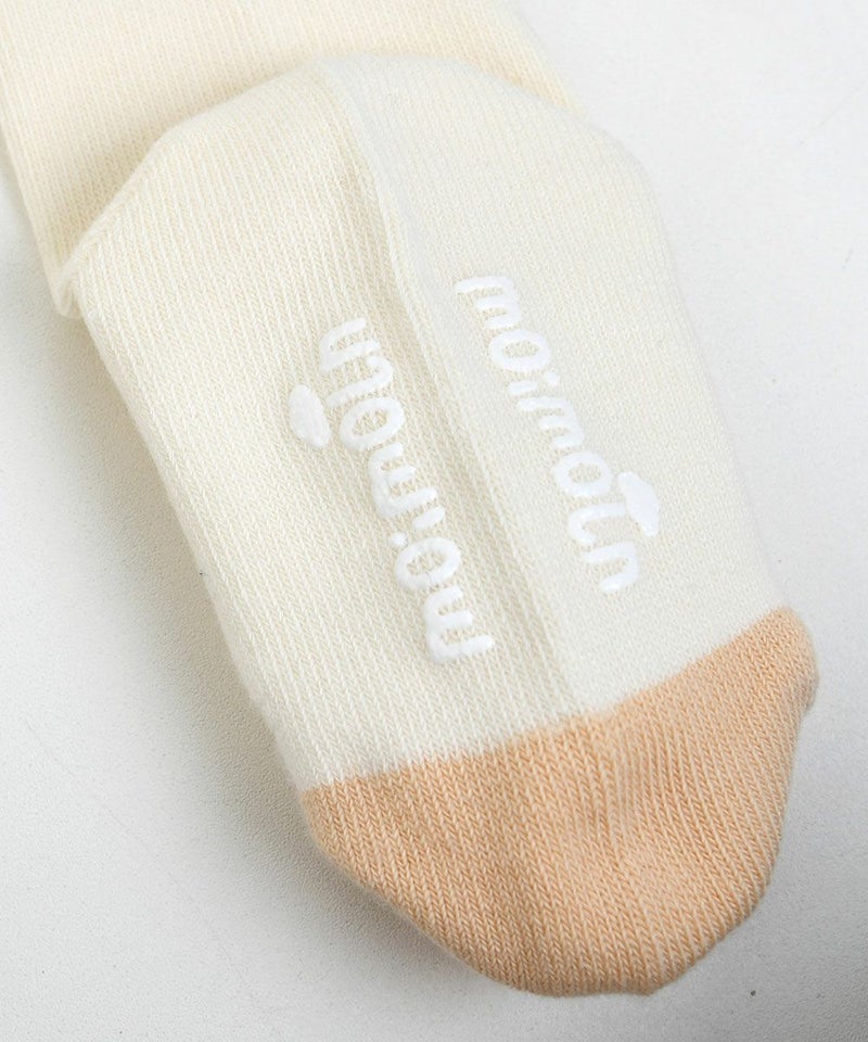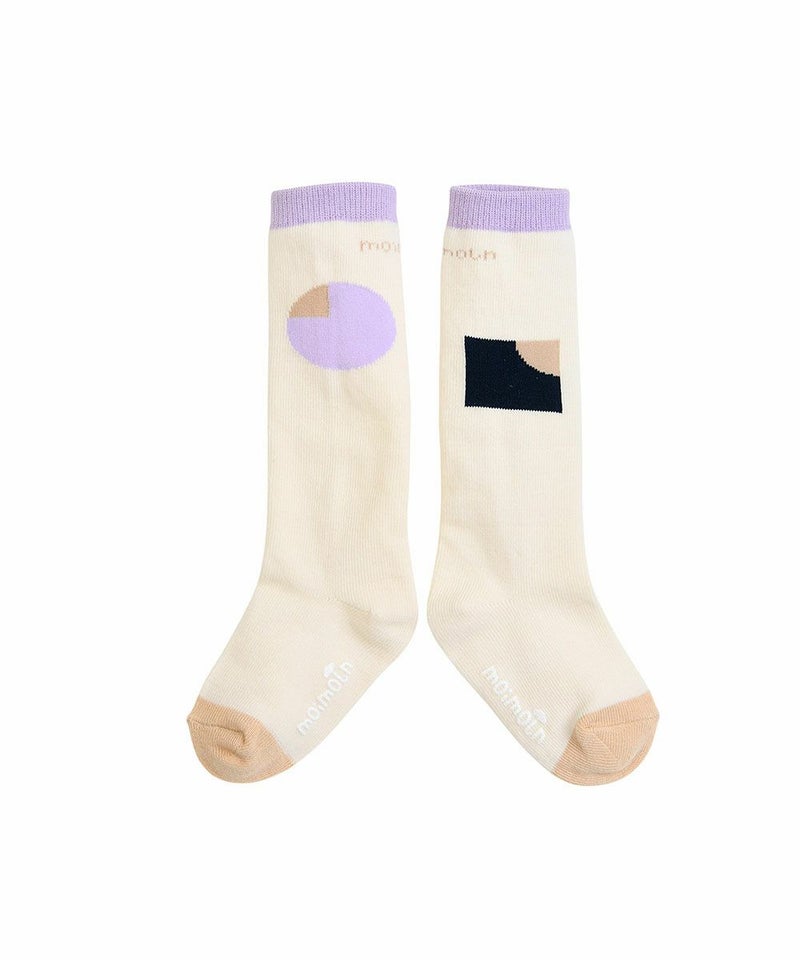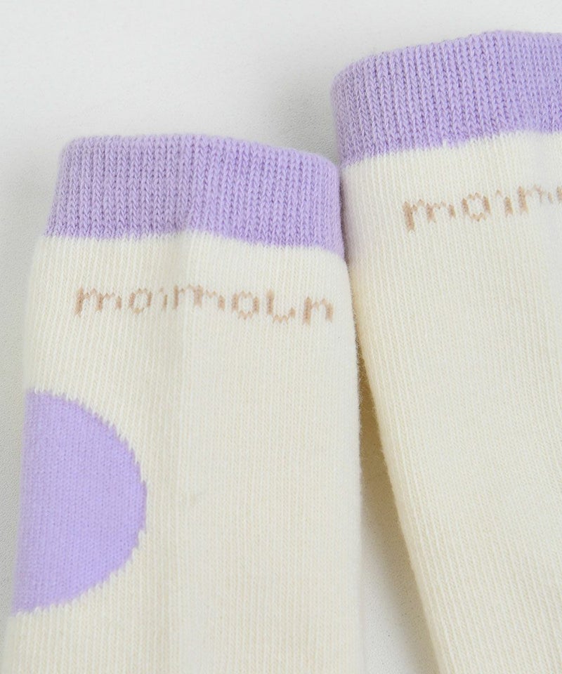 2トーンの大きな図形モチーフがポイントのひざ下丈の靴下。左右のモチーフの形や位置が異なるユニークなアイテムです。口ゴム付近にはmoimolnロゴ、足の裏には滑り止めがついており、小さなお子様にぴったり。セットアップ(M253STB01P)、ワンピース(M253OPB02P)とのコーディネートがおすすめです。