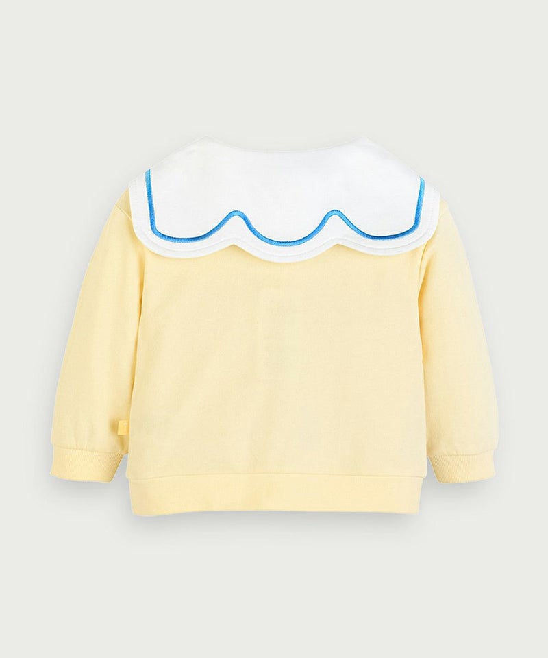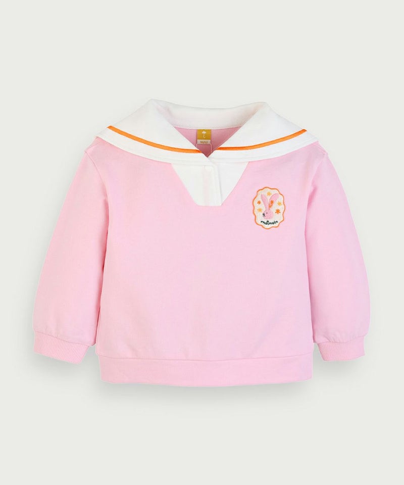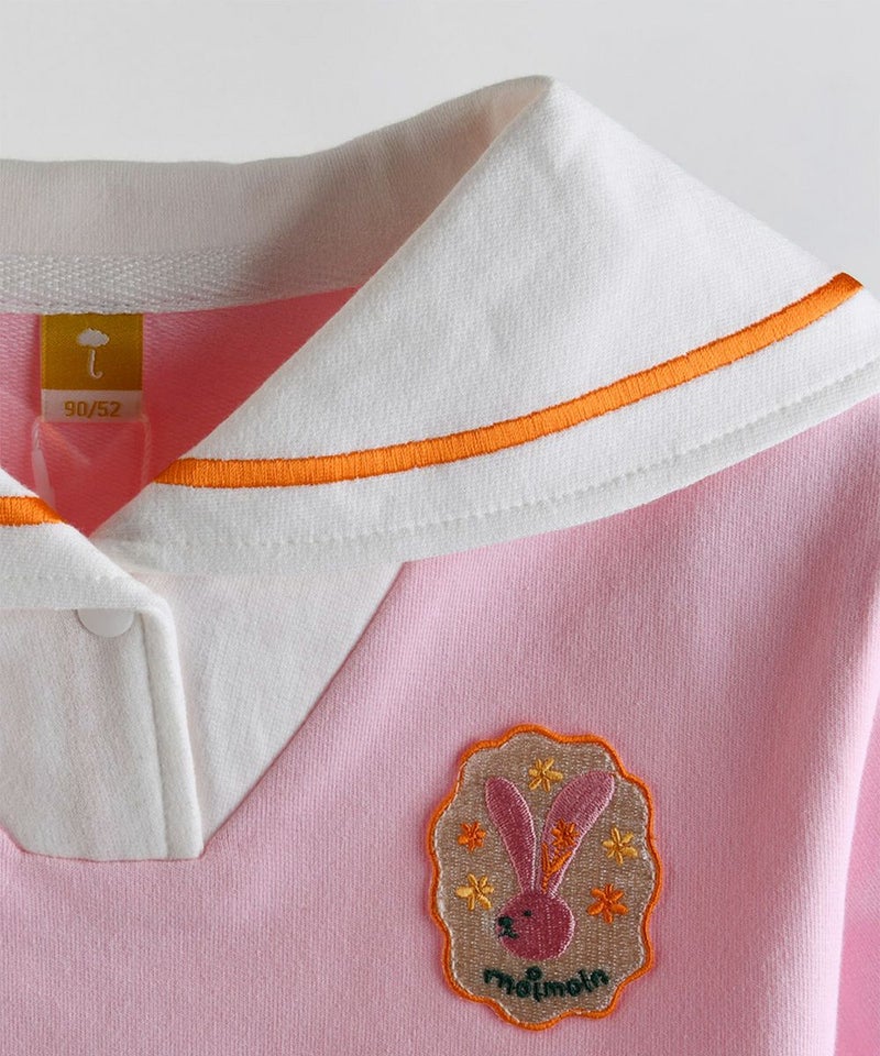 襟に沿ってカラー刺繍のラインが目立つ襟付きトップスをインにレイヤーした様なトップスには、胸元にかわいいライオンの(LEOレオ)とうさぎの(PUPU ププ)モチーフの刺繍が付いています。