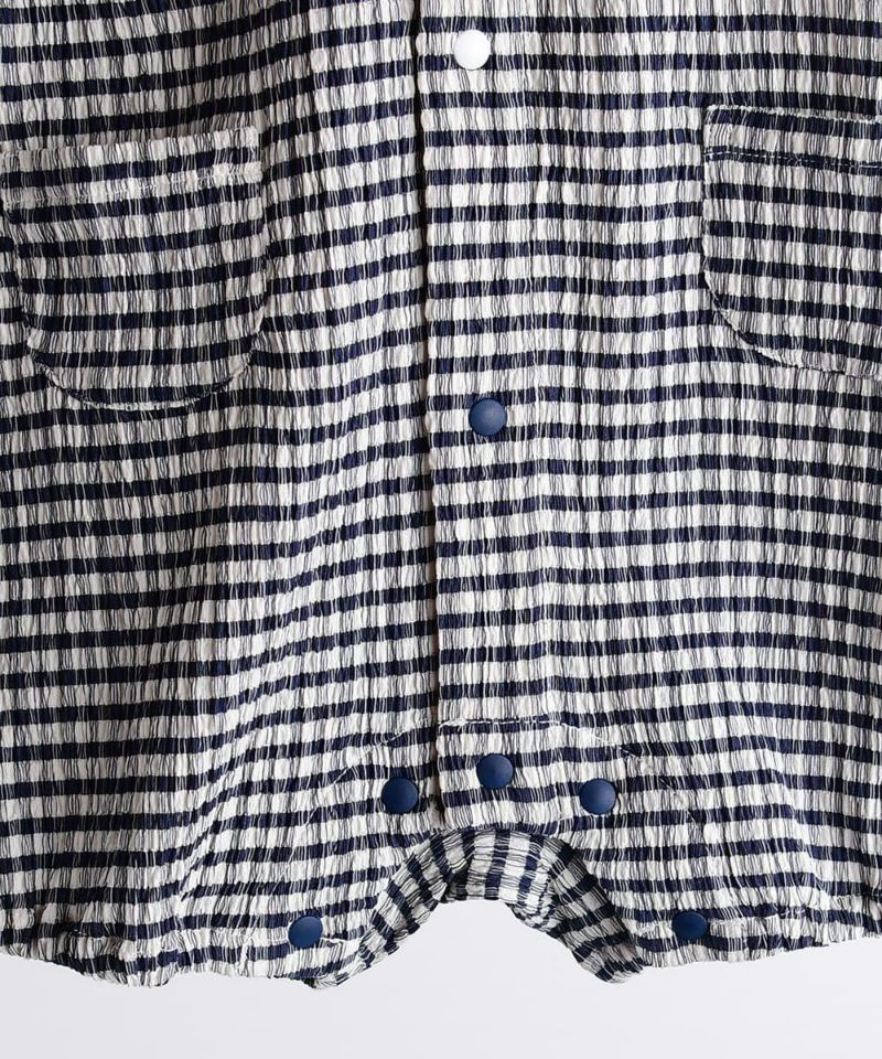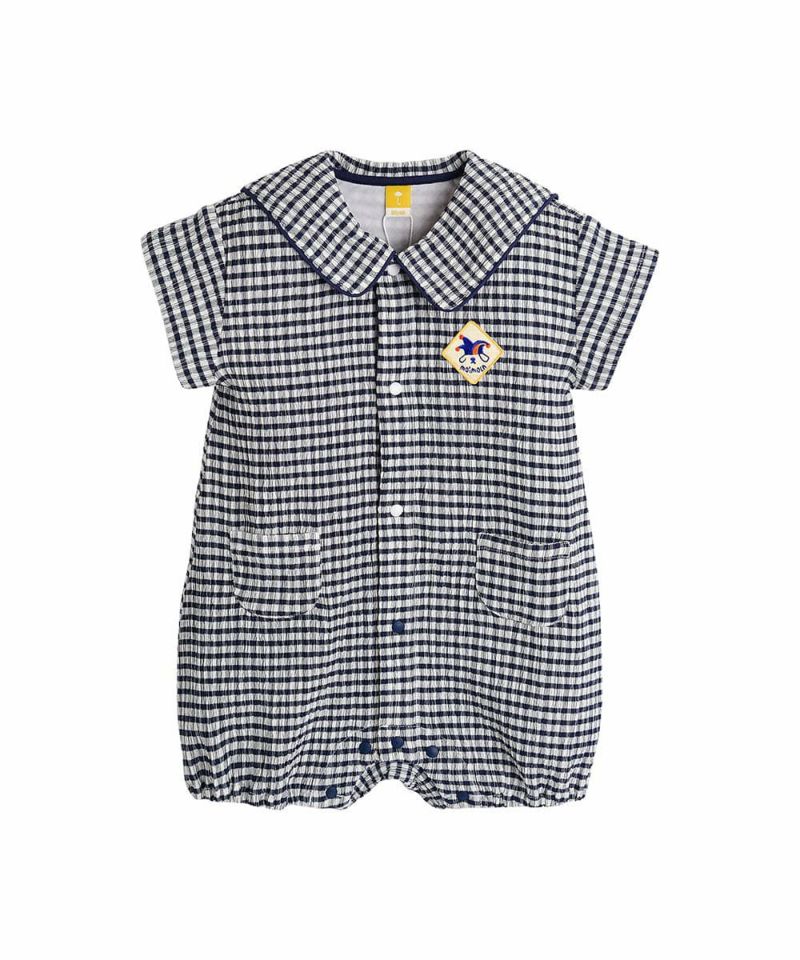 涼しい生地感のチェックの柄が3分丈カバーオール。夏に快適に過ごせる素材感で、襟付きなのでおしゃれに着用いただけます。バックのピエロの刺繍もポイントです。