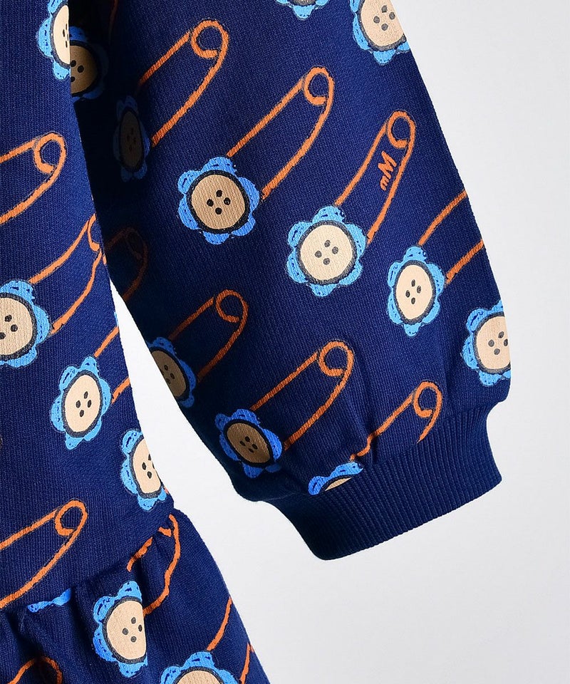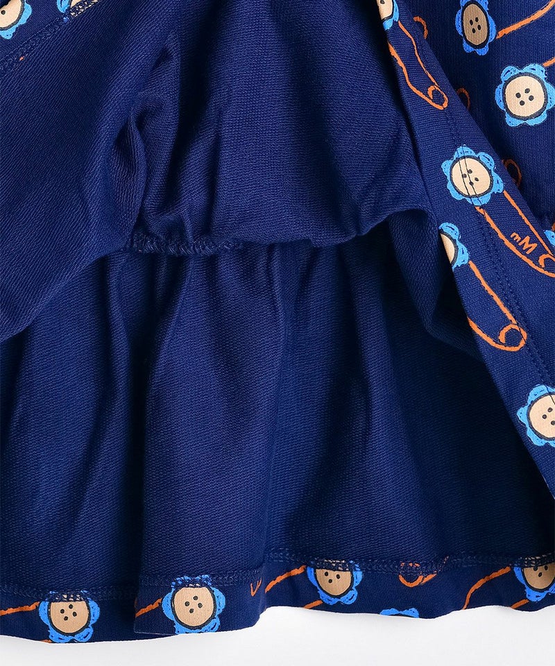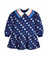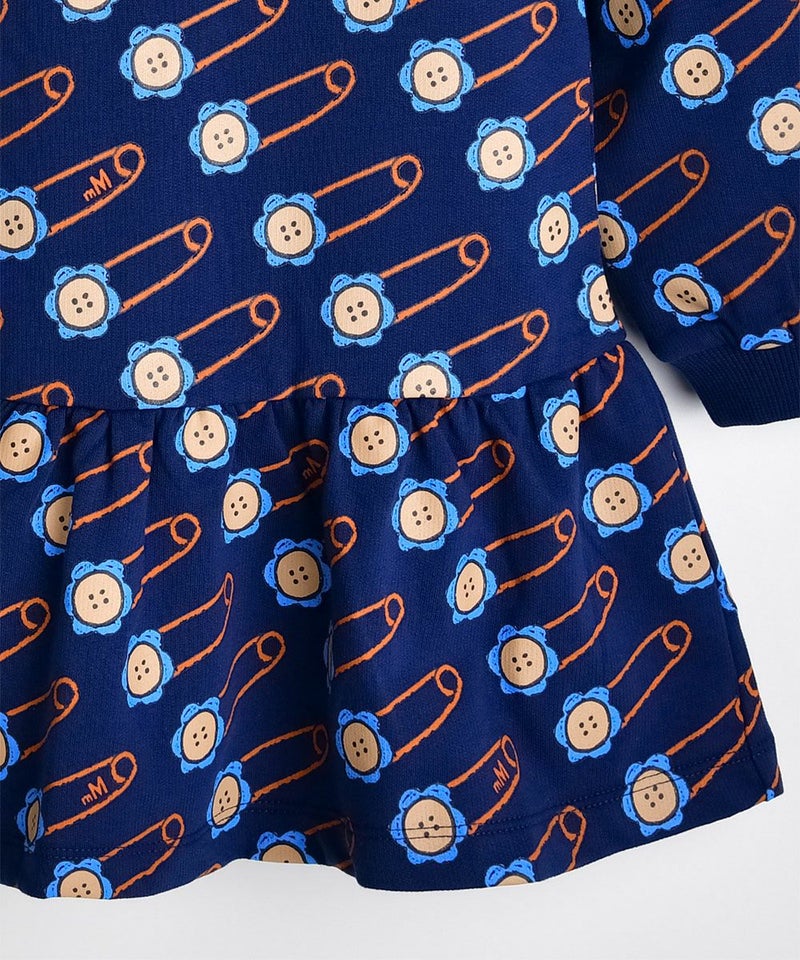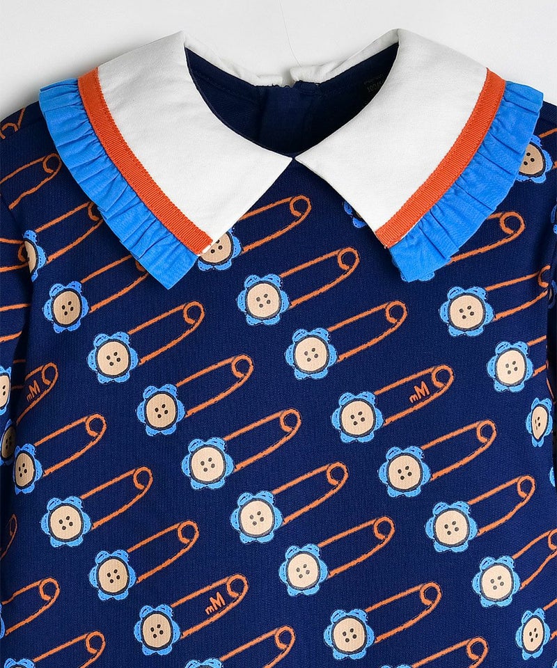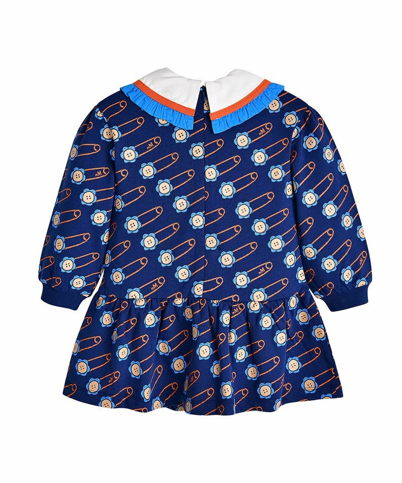 花の安全ピンの柄が特徴的なビッグカラーワンピース。彩度の高いブルーフリルとオレンジのテープ配色がポイントのアイテムです。