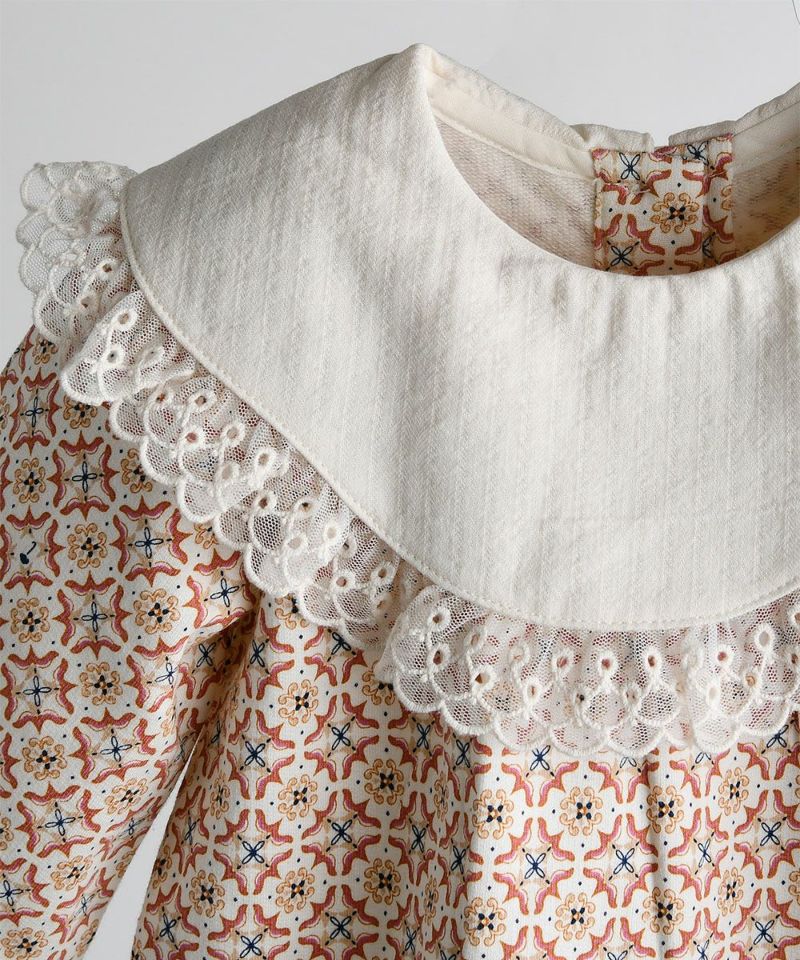 幾何学プリントのAライントップスのセットアップ。ユニークな形のレースの襟が女の子らしさをアップしてくれるアイテムです。