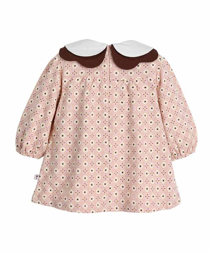 幾何学パターンのワンピース。トーンダウンしたピンクカラーにブラウンカラーの襟が大人っぽく、二重襟がポイントのアイテムです。