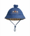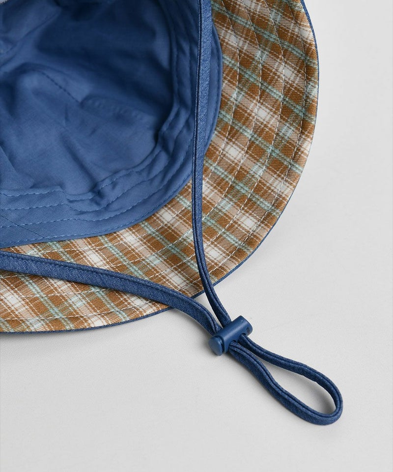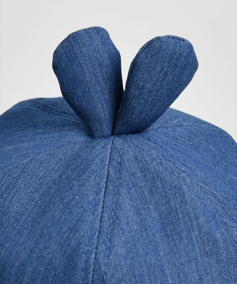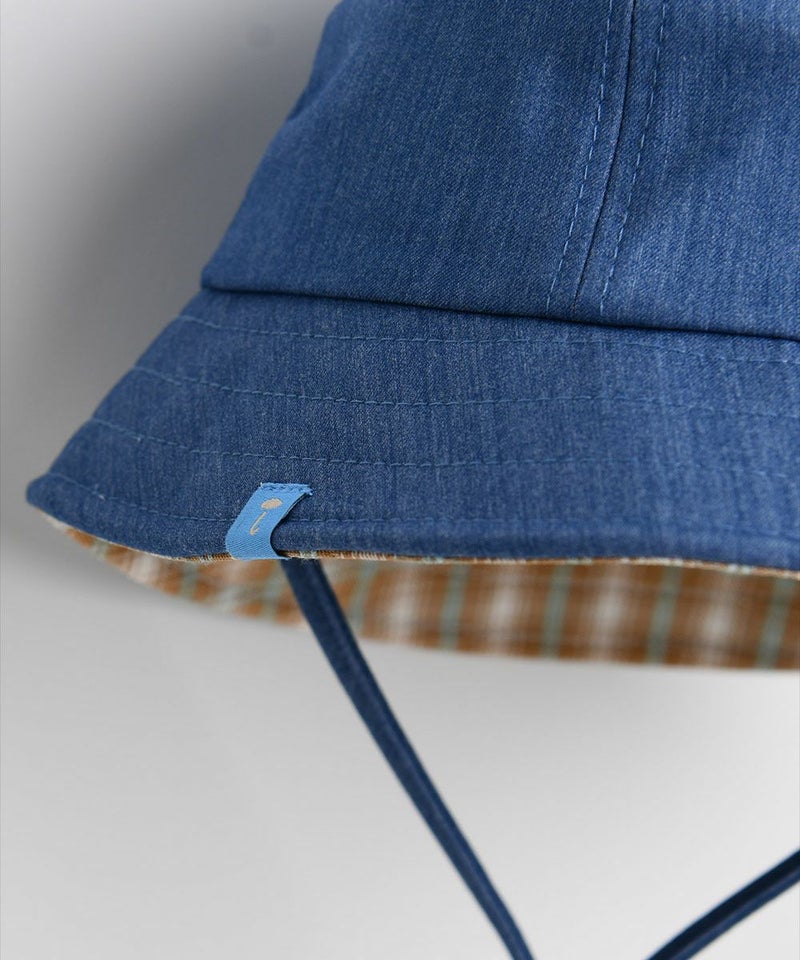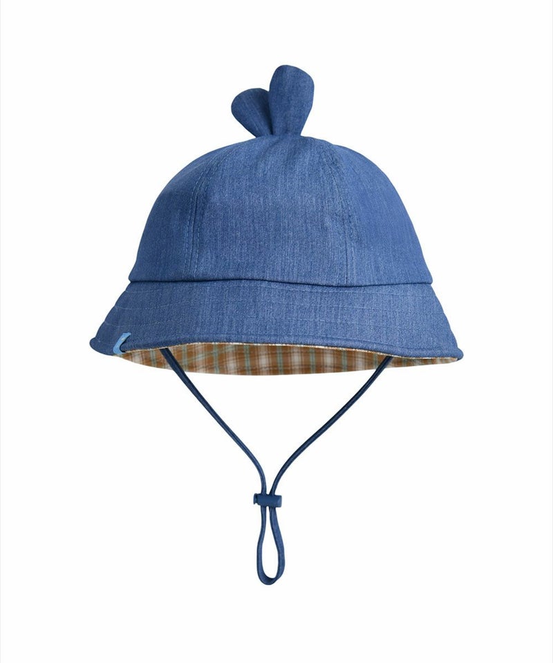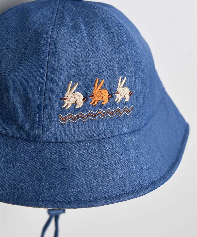 かわいいうさぎの刺繍と耳飾りがコーディネートにポイントを与えるバケットハット。デニムのヘジ素材と内側のチェック配色がユニークかつカジュアルで、ストッパーでサイズ調節が可能なアイテムです。