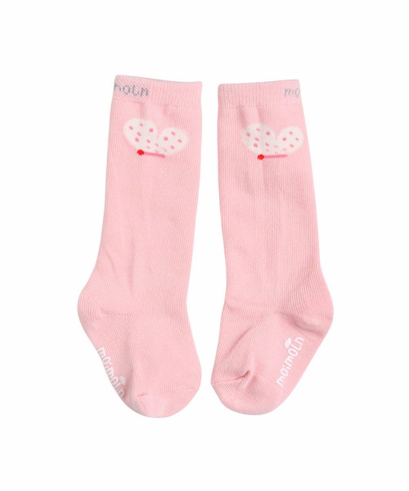 春の感らしく愛らしい蝶をモチーフにポイントを与えたソックス。ロミブルーマー上下(M251STB08P)等のピンク系のアイテムとのコーディネートがおすすめです。