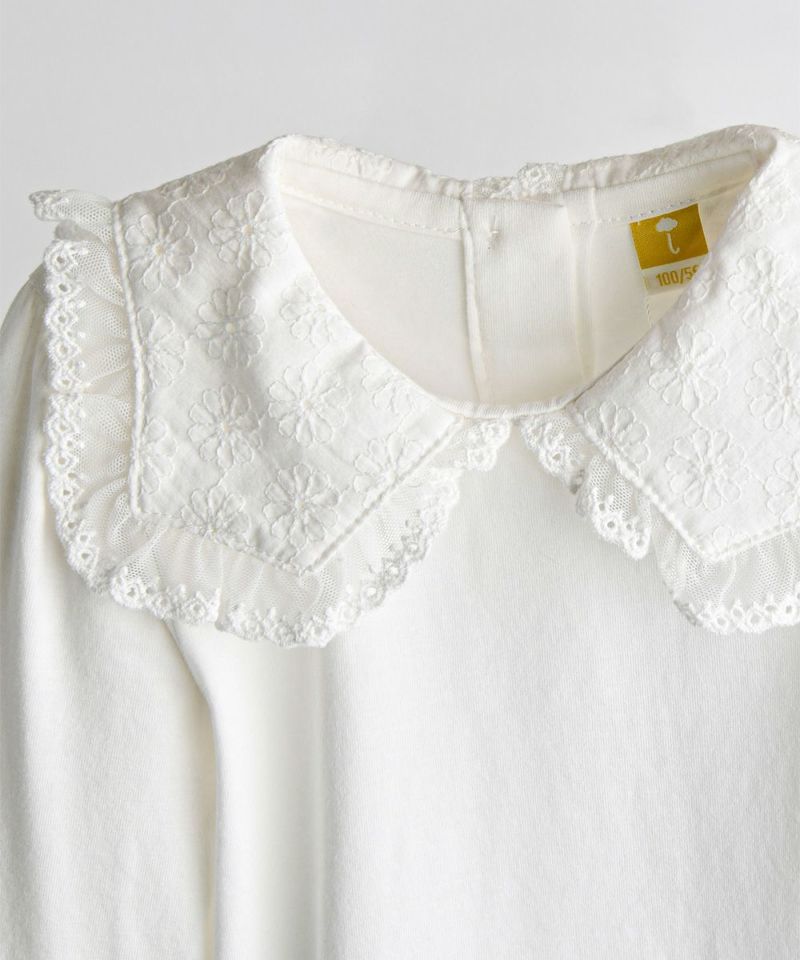 柔らかいモーダル素材の襟付きのTシャツ。立体的なフラワーの襟と襟の先のレースがかわいらしく、ベスト、パンツなど様々なコーディネートが楽しめるアイテムです。