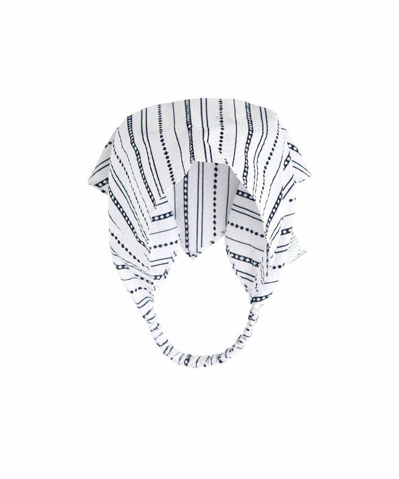 トレンディなヘアスカーフをバンドを使って楽にスタイリングできるようにデザインしたヘアスカーフ。ラブリーで顔を華やかに明るくしてくれるデザインで、スタイリングしやすく、マリンシリーズのアイテムと同じ生地を使用しているため、コーディネートをより統一感のあるものにしてくれるアイテムです。内径は最大24cmまで伸びます。