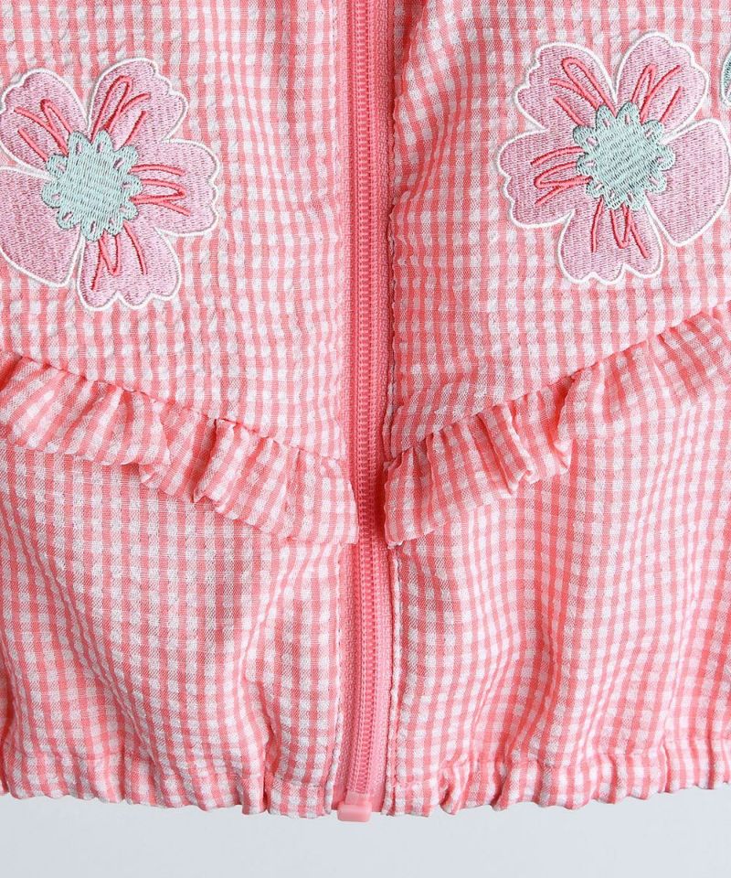 じめじめして汗をかきやすい暑い夏でも体に引っ付きにくい清涼感を感じさせるシアサッカー生地の長袖ウィンドブレーカー。前板の花刺繍とフリル装飾で女の子っぽくて可愛らしさを表現したデザインのアウター。
