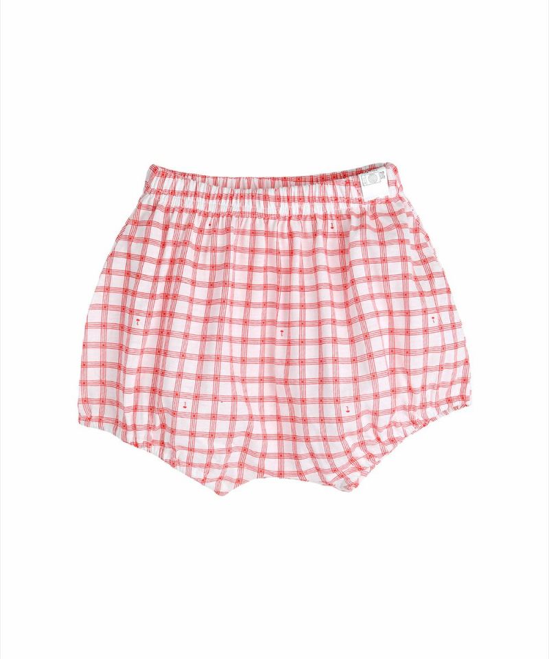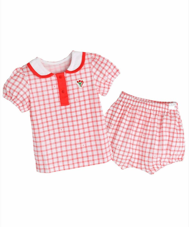 柔らかく肌が敏感な赤ちゃんにおすすめのモダール混生地のセットアップ。パイピング付きの丸襟とチェック柄、チェリーの刺繍ワッペンがポイントでボトムのブルマ風のショートパンツがとってもかわいいです。品番(M2522AN08P)とのコーディネートもおすすめです。ベビーギフトとしてもおすすめです。