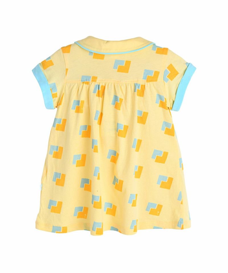モイモルンらしいソフトでユニークな図形の総柄半袖ワンピース。端正な襟付きのワンピースで、襟、プラケット、袖口、ボタンに配色されたブルーカラーがポイント。エンザイム加工により着心地がさらに柔らかく洗濯後も変形が少なく、同じ柄のセットアップ(M252STB01P)と兄妹ルックでおすすめです。