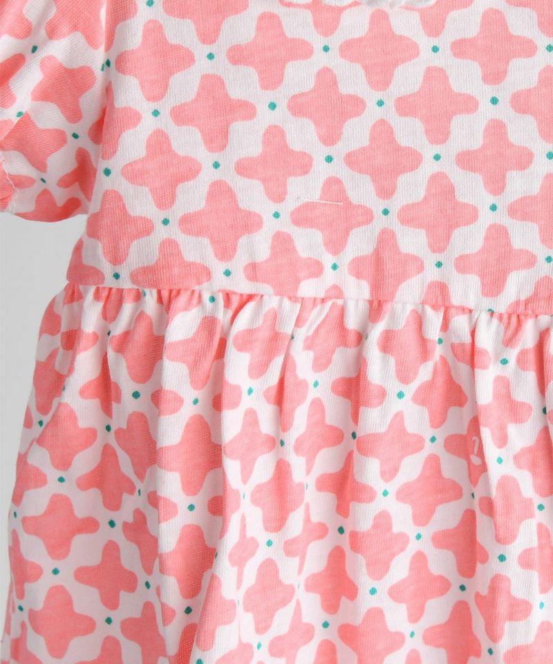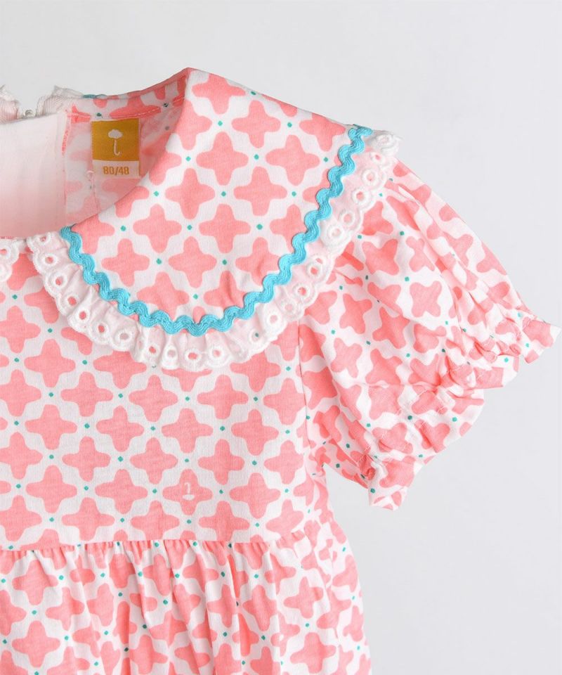 華やかなピンクカラーの幾何学図形総柄でデザインされたレトロなムードの半袖ワンピース。襟のパンチングレースとミントカラー配色テープがラブリーで、エンザイム加工により着心地がさらに柔らかく洗濯後も変形が少ないアイテム。