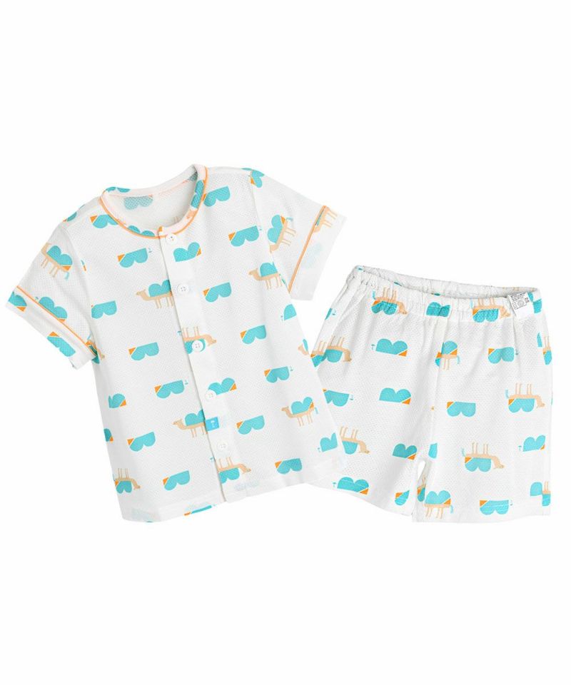 通気性に優れ、涼しく体に付きにくいレーヨンメッシュ生地の半袖ルームウェア。かわいいラクダのプリントがポイントで、ブルーグリーンとオレンジのカラー配色がモイモルンらしさを出しています。ベビーギフトとしてもおすすめです。