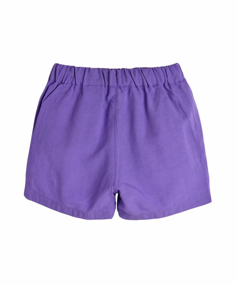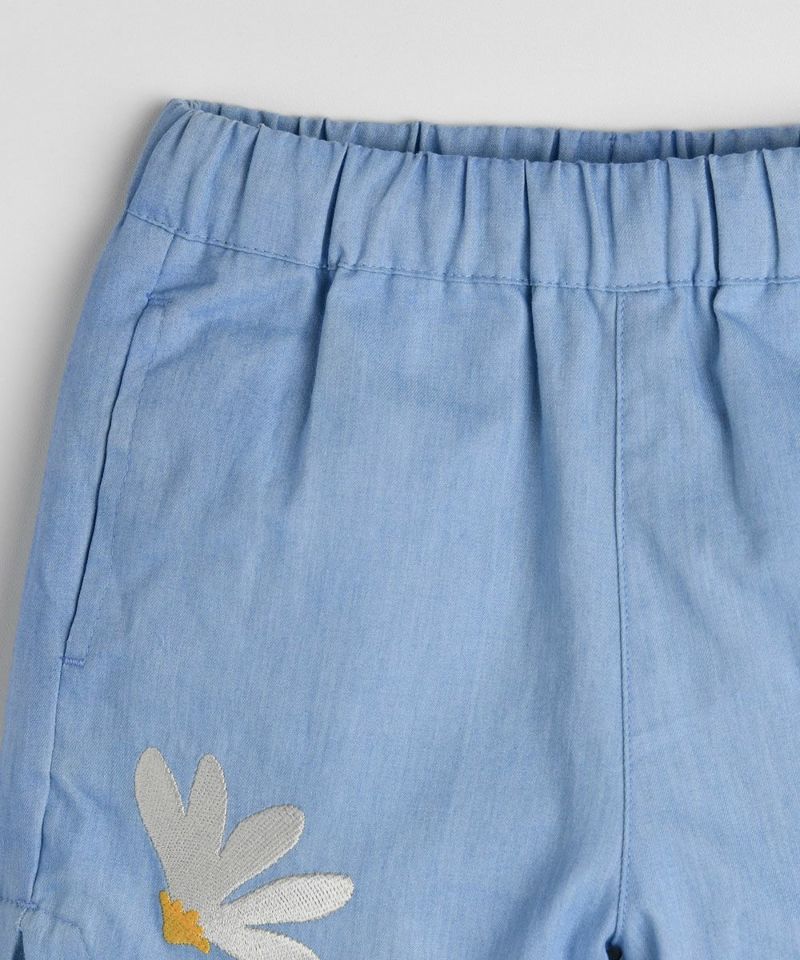 軽くて涼しい素材感の4分丈のパンツ。コーディネートしやすい薄色デニムのカラーと落ち着いたおしゃれな紫色の2色展開。パンツ左右下のビッグフラワー刺繍がポイントで、ゆったりとしたシルエットで活動性が良く、裾のスリット部分を丸く処理することでかわいいスタイルを演出したアイテムです。
