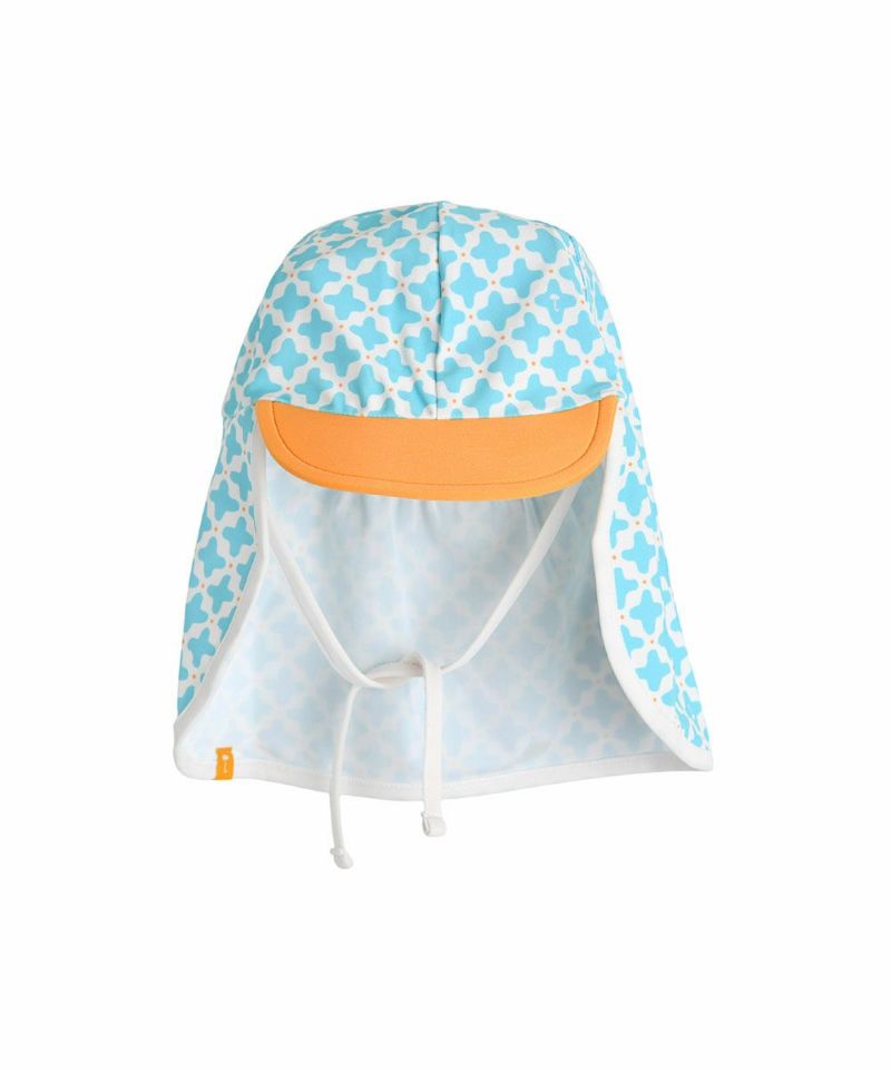 ユニークな図形グラフィックでレトロなムードのラッシュガード。お腹を楽にしてくれるレギンススタイルのパンツで水遊びの時も快適に活動できて、強い紫外線から肌を守り、日差しを遮る帽子が構成され肌焼けしないので実用的なアイテム
