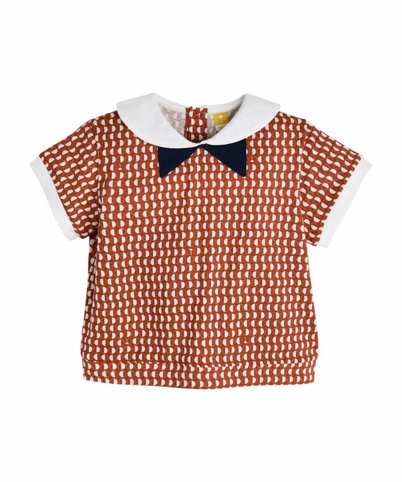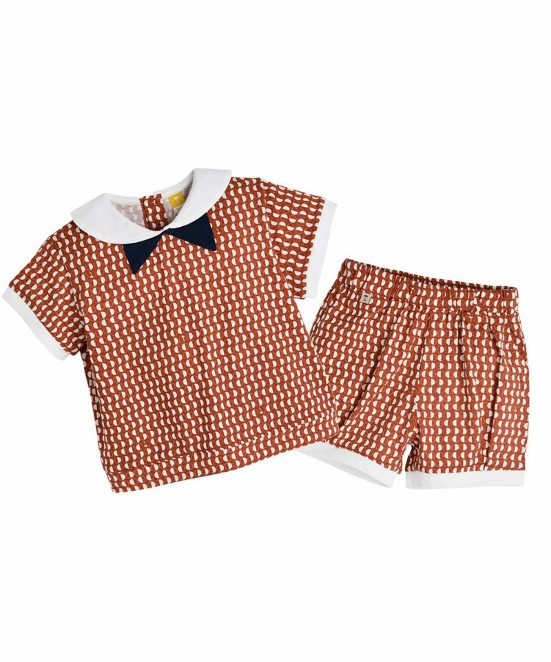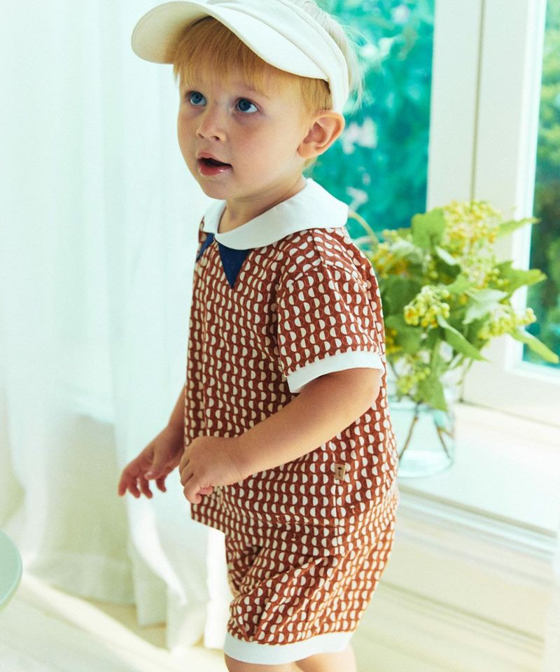 上着:4部 + ボトム:4部ムードのあるブリックカラー感のレトロな幾何学柄セットアップ。夏のお出かけ着としておすすめ♪人気の襟付きデザインがポイントです。