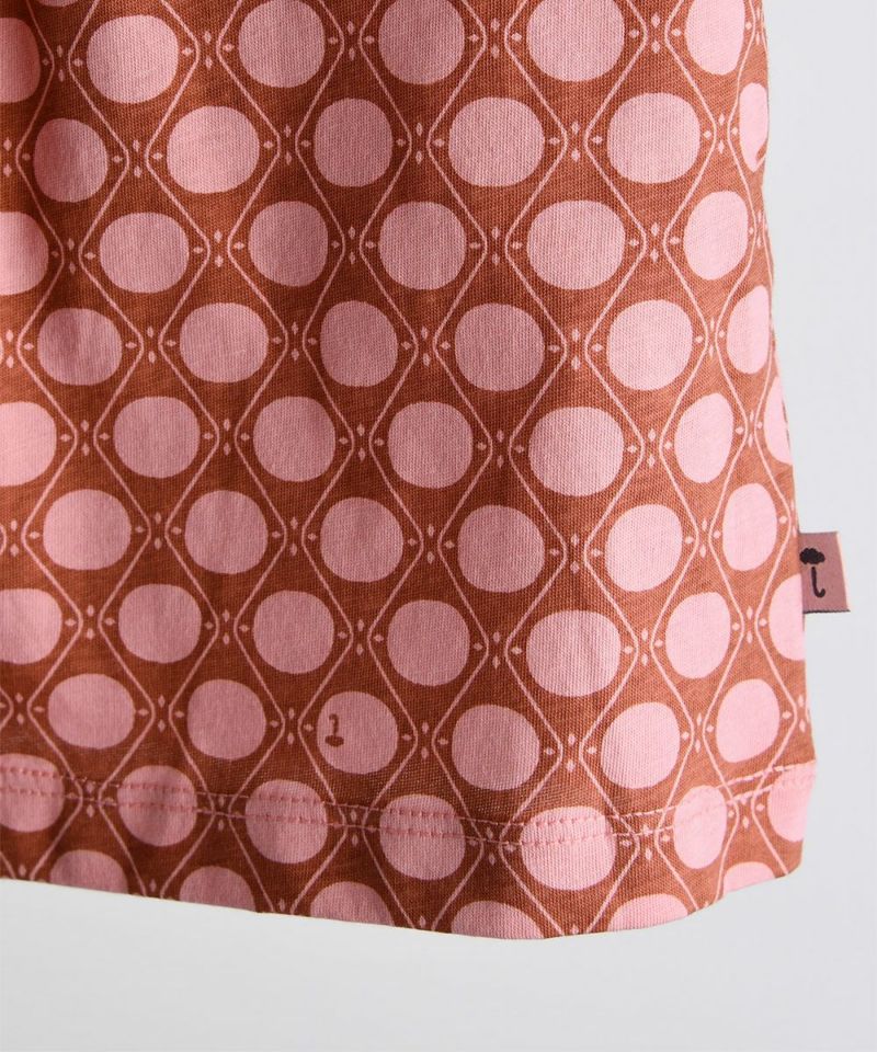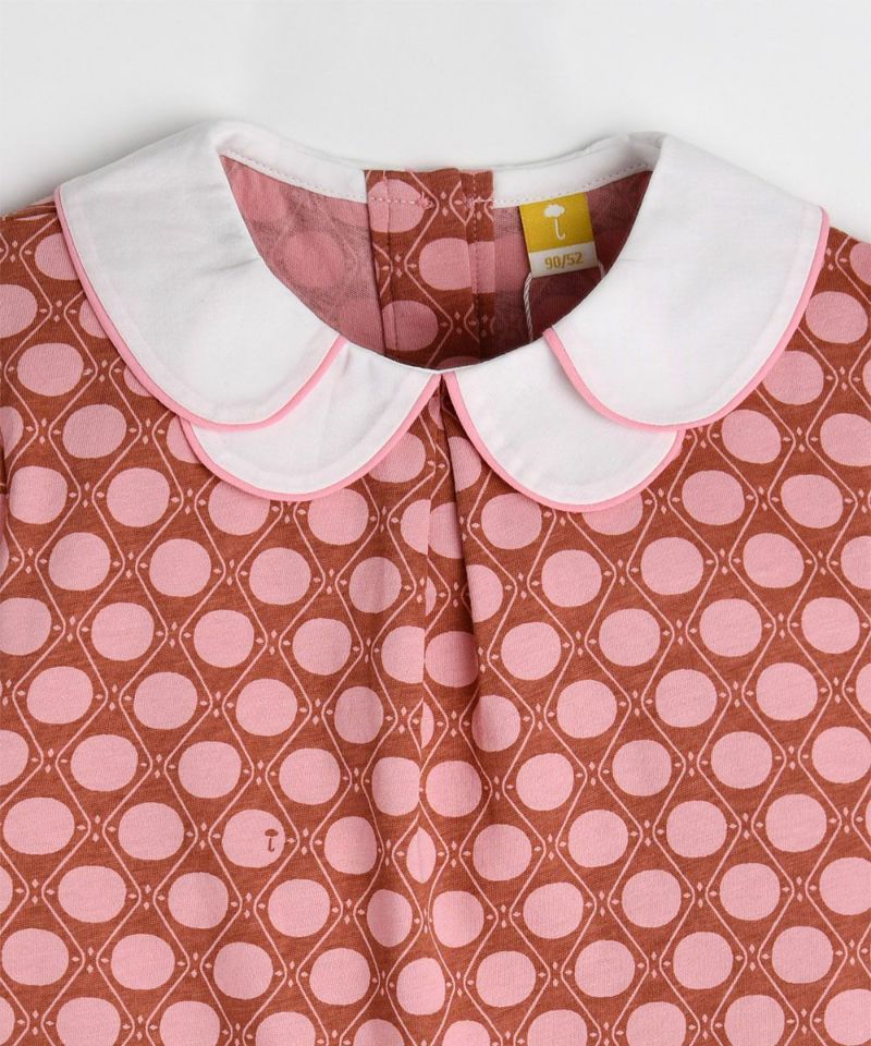 リピートされた丸のパターンがレトロなムードを醸し出す半袖セットアップ。二重襟のピンク配色がラブリーなアイテム。同じシリーズの男の子用セットアップ(M252STB04P)と兄妹ルックがおすすめです。