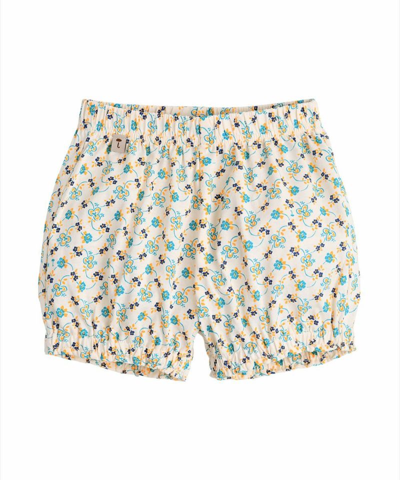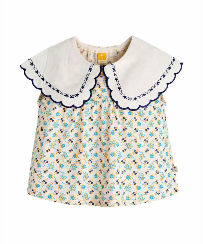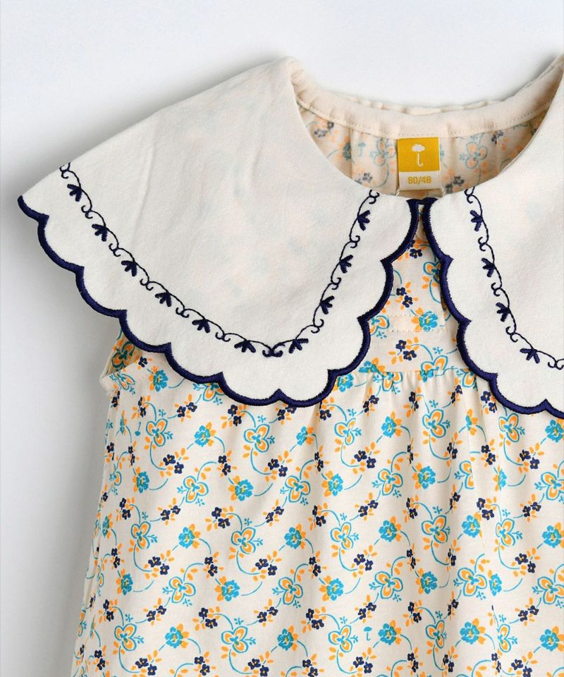 レトロなムードのフラワー総柄でデザインされた半袖セットアップ。大きな襟に施された繊細な刺繍がポイントで、Aラインに広がるトップスと可愛いブルマフィットズボンでラブリーなスタイリングが可能なアイテム。エンザイム加工により着心地がさらに柔らかく洗濯後も変形が少ないアイテム。