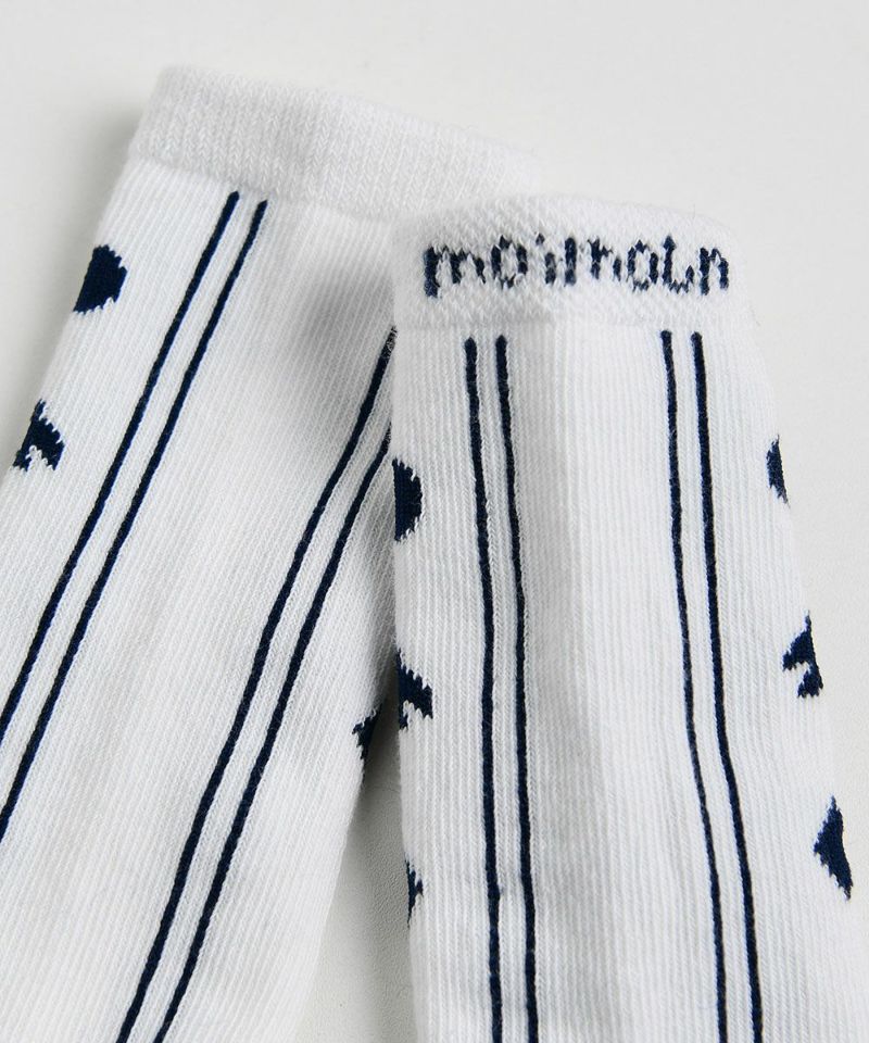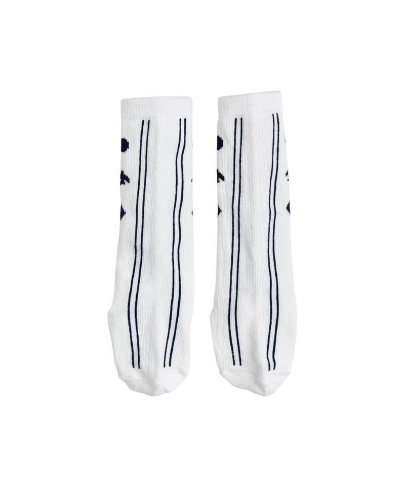 ホワイトにネイビーカラーがポイントとして施されたアイテムで、端正で涼しげな雰囲気のハイソックス。ユニークな図形モチーフはマリンシリーズとコーディネートにぴったりです。