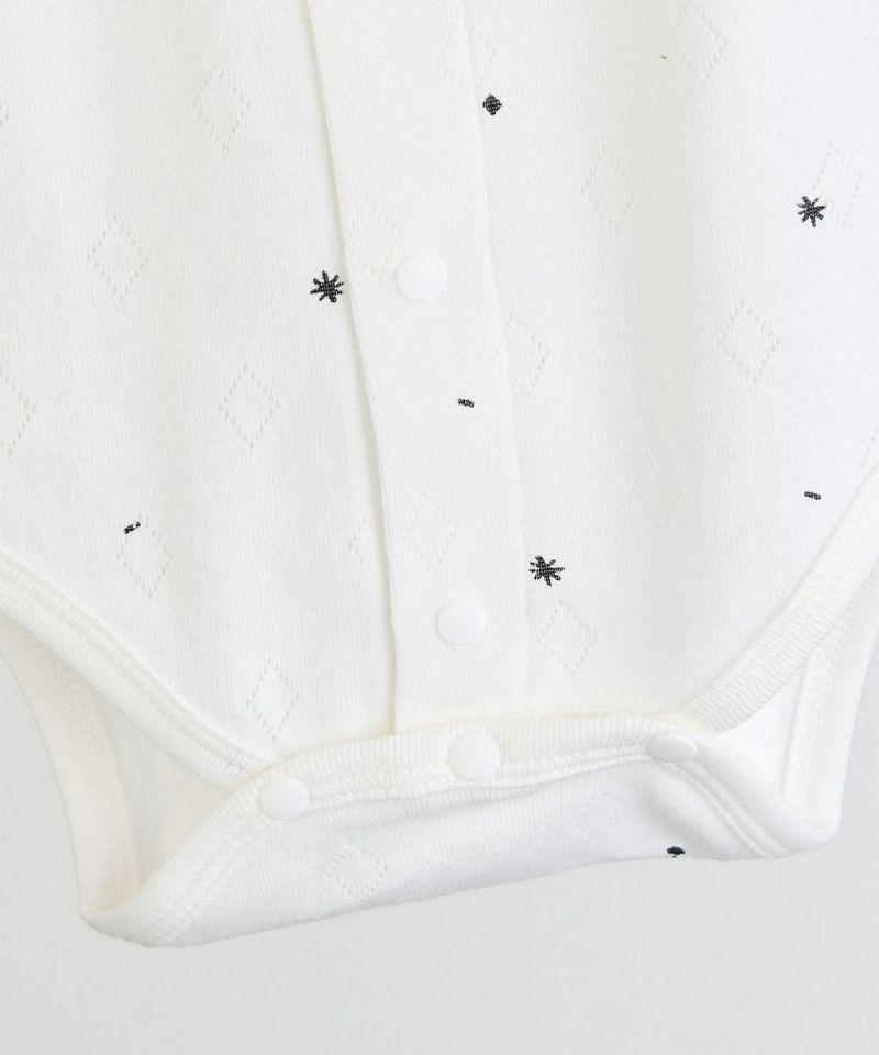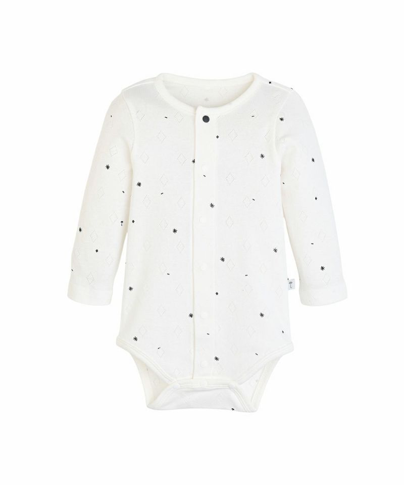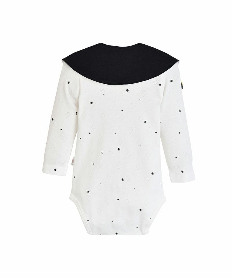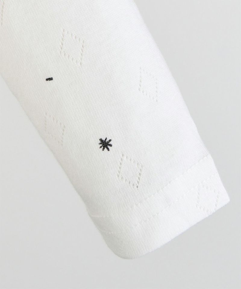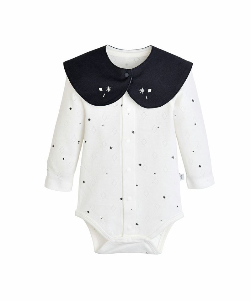 ダイヤアイレット生地の上に小さな柄をちりばめたボディースーツ型の長袖ロンパースとスタイのセット。襟風のスタイはリバーシブルで使えるアイテムでさりげないブランドロゴのタグも付いています。フロントから股下までスナップボタンで大きく開くのでオムツ替えやお着替えも簡単。出産祝いなどのギフトにもおすすめです。minimoiとは・・・新生児のための新しいmoimolnのオリジナルシリーズ。