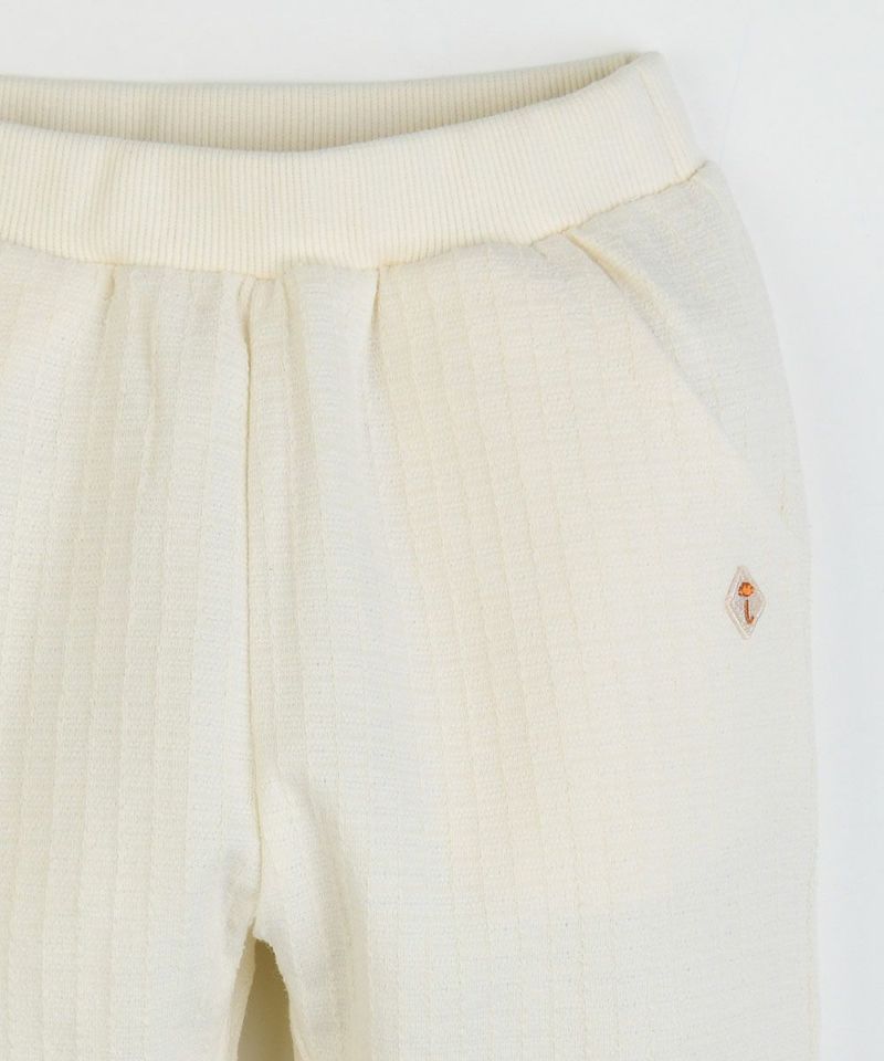 高級感あるジャカード生地を使用したリブ付きロング丈パンツ。フロントは両側にポケット、後ろのポケットにはラベルとレースが施され、ウエストゴムがしっかりしていて元気なお子様にもぴったり。シンプルながらもカジュアルになりすぎず、どんなトップスともコーディネートしやすいパンツです。