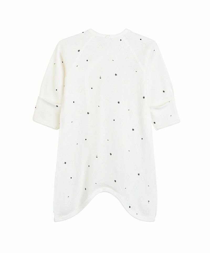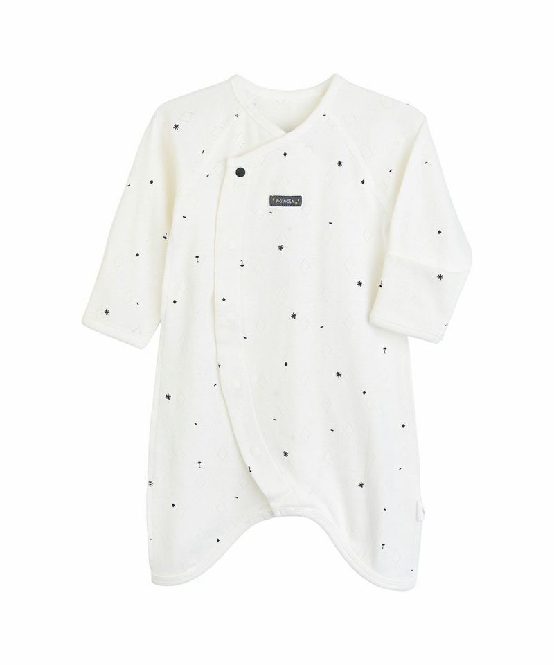 ダイヤアイレット生地の上に小さな柄をちりばめ、フロントにはmoimolnのロゴタグを付けたコンビ肌着。外側は簡単なスナップタイプで着替えのしやすい仕様に加え、脇の縫い目は肌に触れない外縫い仕様なので、赤ちゃんの薄い皮膚にもやさしい肌あたりとなっています。袖口は折り返すと引っかき防止のミトン代わりとなる仕様で、出産祝いなどのギフトにもおすすめです。minimoiとは・・・新生児のための新しいmoimolnのオリジナルシリーズ。