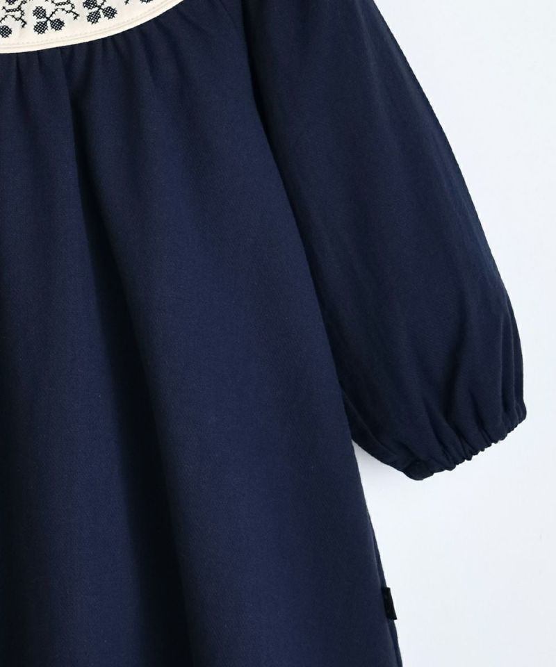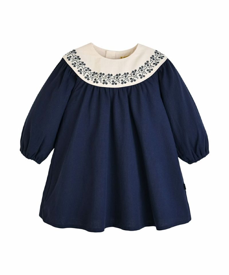 クロスステッチのような花の刺繍とAラインのシルエットがナチュラルで端正な印象を与える長袖ワンピース。肌触りが柔らかいウーブン素材を使用し、バックのファスナーで脱着も簡単、大事なお子様のために、ファスナーガード付きで肌当たりもやさしい仕様。同色の裏地もしっかり付いているので安心です。クリーム×ネイビーの組み合わせが落ち着いた印象を与え、特別な日にぴったりなアイテムです。