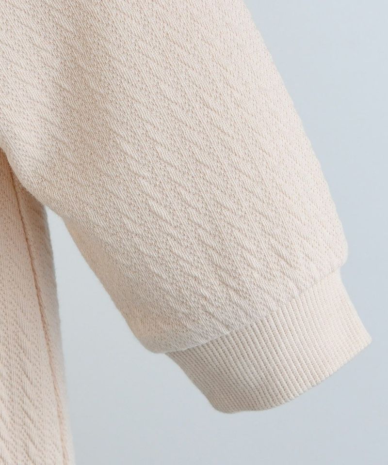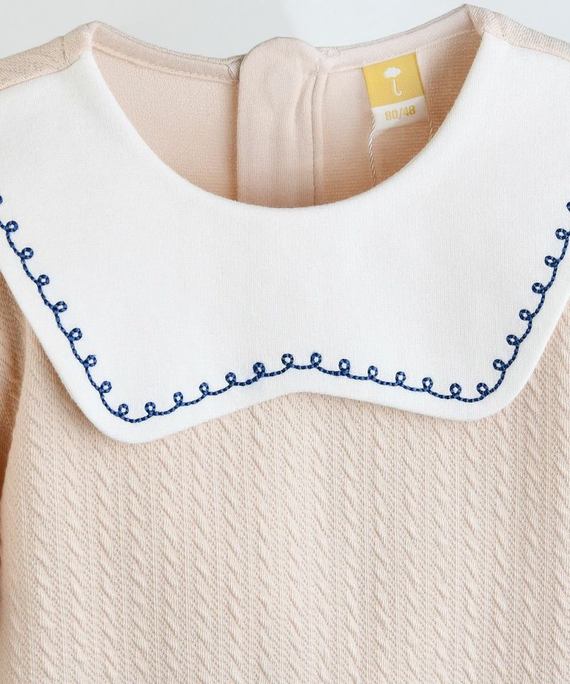 アイボリーにネイビーの刺繍がアクセントになったスタイ風の襟付きカバーオール。フロントのミニポケットにキツネのネロの刺繍がとてもかわいく、袖口と裾はリブでしっかりフィット。股部分はスナップボタン、背中はファスナーで脱着が簡単、ファスナーの内側にはファスナーガードを付け、肌への刺激を防止しています。※襟は取り外し不可。セットアップ(M253STB18P)と兄妹ルックがおすすめです。