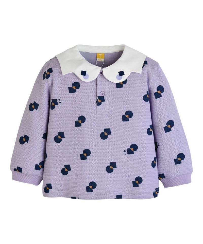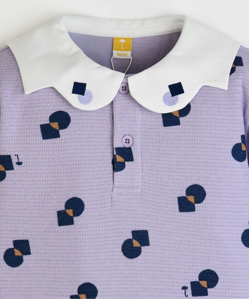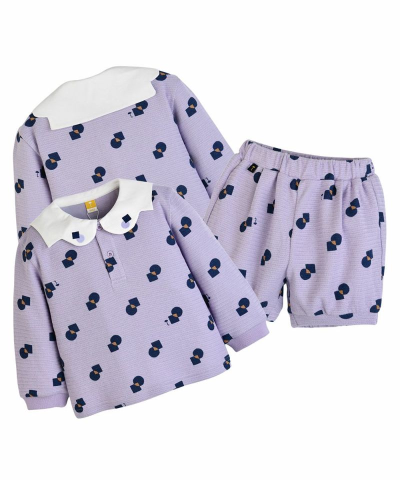 幾何学の様な図形パターンを使用した厚みのある素材感のジャカード生地の長袖トップスとブルマパンツのセット。襟のユニークな形とサークル刺繍がポイントで、ムードのあるイエローとパープルのカラートーンがポップながらもクラシカルな雰囲気を醸し出すアイテム。トップスはフロントにボタンが付いていて脱着も簡単。ワンピース(M253OPB02P)と兄妹ルックがおすすめです。