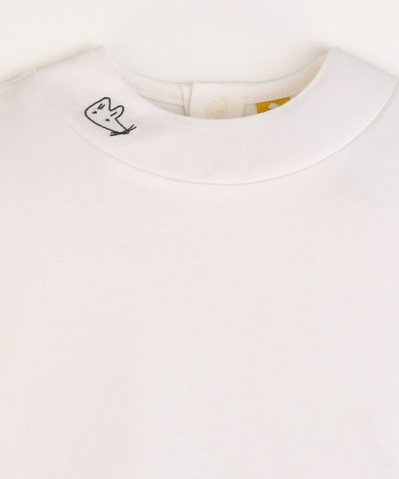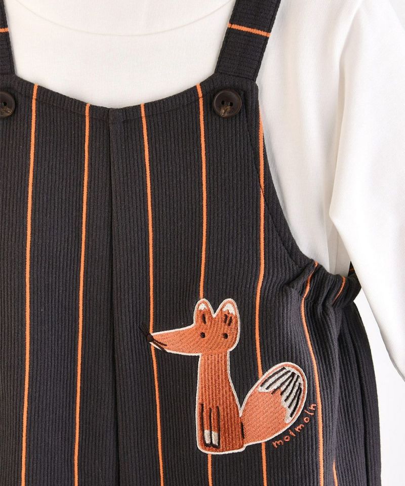 ハイネック長袖トップスとゆったりとしたフィット感の7分丈オーバーオールのセット。肌触りがよく耐久性に優れた素材のトップスは首元にキツネのネロの刺繍入り、背中のスナップボタンで脱着も簡単。オーバーオールは股下はスナップボタン、背中はファスナー付きで脱着しやすく、内側にファスナーガードを付け、肌への刺激を防止しています。差し色としてオレンジのハット(M253CAI02P)と一緒にコーディネートすることがおすすめです。