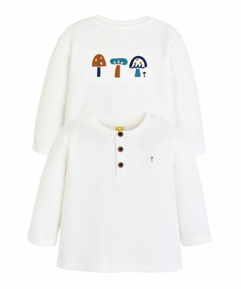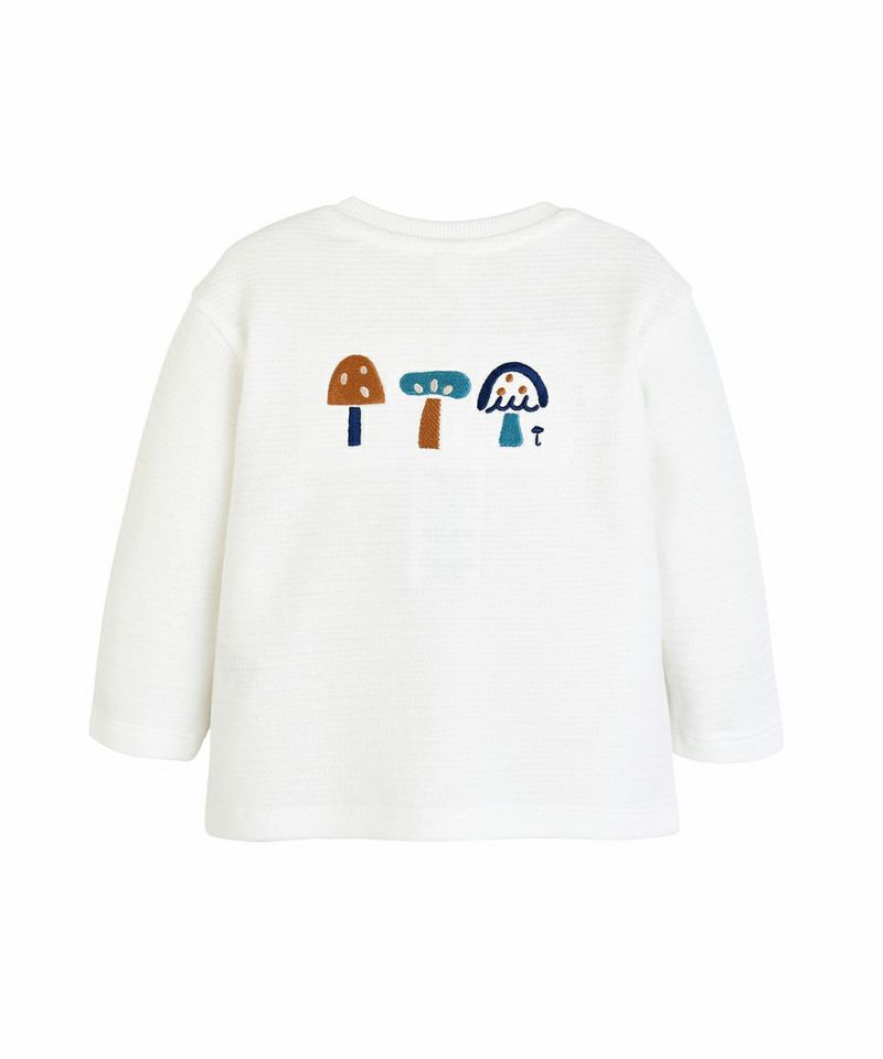 ソフトなタッチ感のジャカード素材を使用したヘンリーネックの長袖Tシャツ。moimolnロゴとステッチが描かれた可愛いボタンと胸元のブランドマークのワンポイント刺繍、背中にはカラフルなキノコ刺繍でポイントをプラス。ストレッチもしっかりあり、着やすさも抜群。織り目のデザイン上透け感があり、晩夏のまだ暑さの残る季節にもおすすめです。肌寒い日などベストやアウターの中にインナーとして合わせやすいアイテムです。