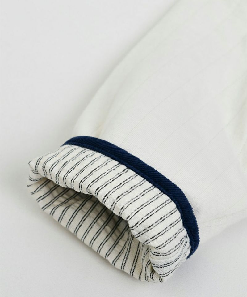 やわらかいコットン三重素材の長袖のノーカラージャケット。胸元やバックの可愛いネコのミャオ(meow)のブクル刺繍がポイントになるアイテム。袖をまくると裾のストライプ柄がアクセントに、フロントの両側にあるミニポケットも付いています。ホワイトとネイビーの配色でお出かけ着としても重宝する商品です。