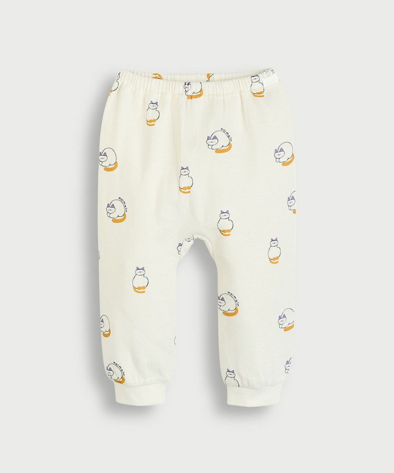 全体的にかわいいネコのミャオ(meow)がプリントが施された長袖トップスとロングパンツのルームウェア。襟元には丸くうずくまったようなネコと耳マスタードカラーの耳のアクセントが、お子さまの愛らしさを引き立ててくれます。袖や裾はリブ仕様で優しくフィットし、スナップボタンでお着替え簡単です。コットン素材の商品は、着心地・肌へのやさしさ・快適性に優れた、毎日着たくなる安心素材です。お子さまのルームウェアとしてはもちろん、ギフトにもおすすめの商品です。