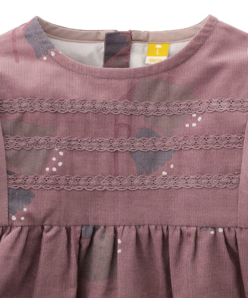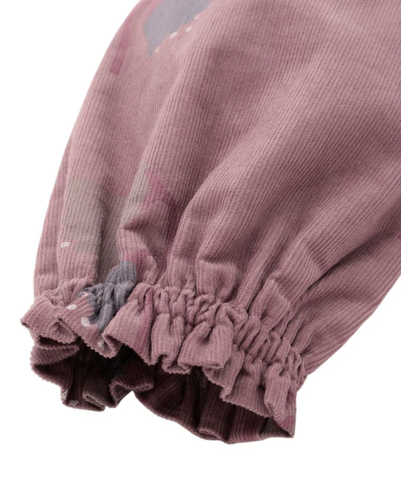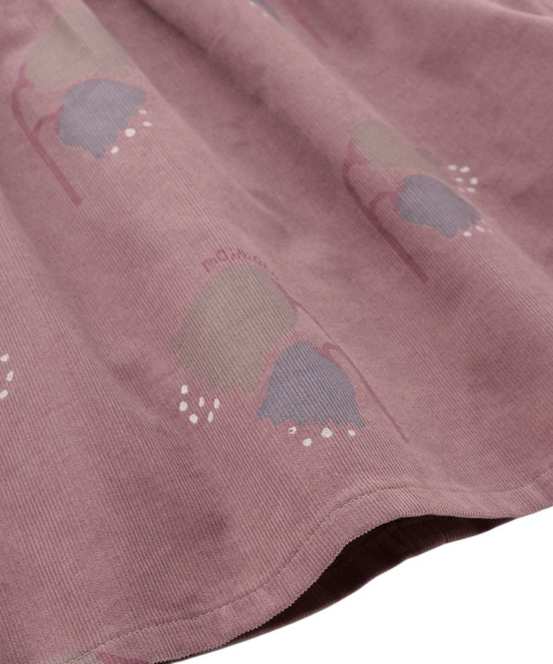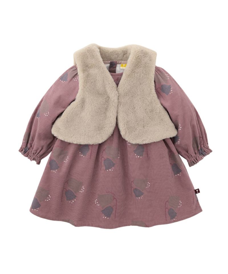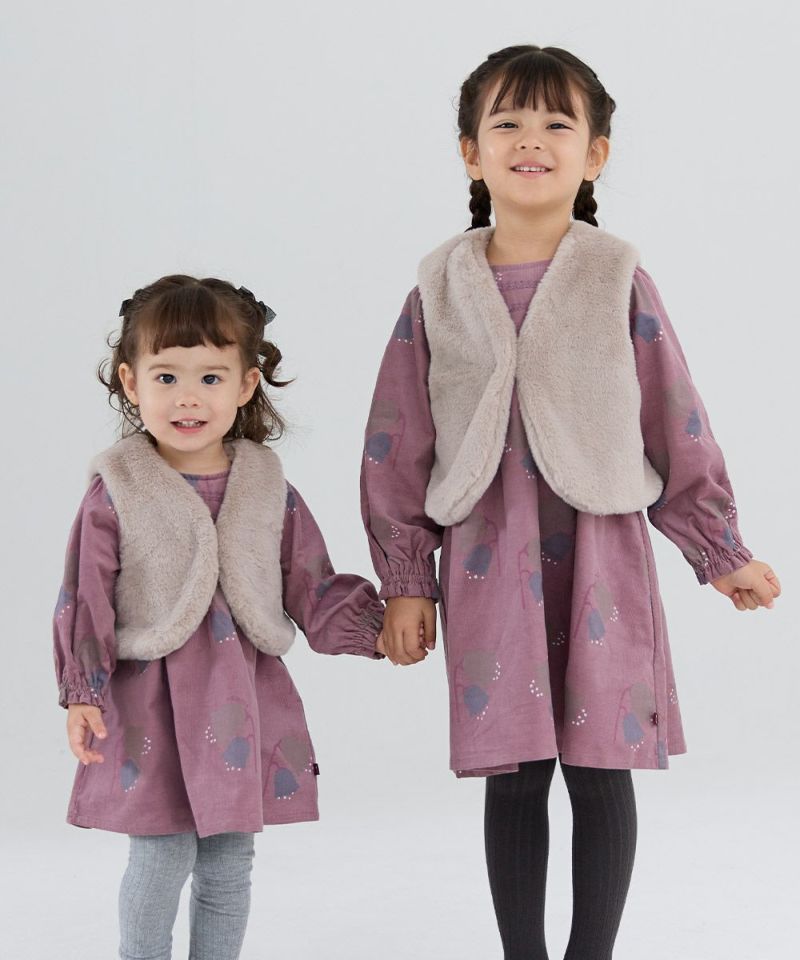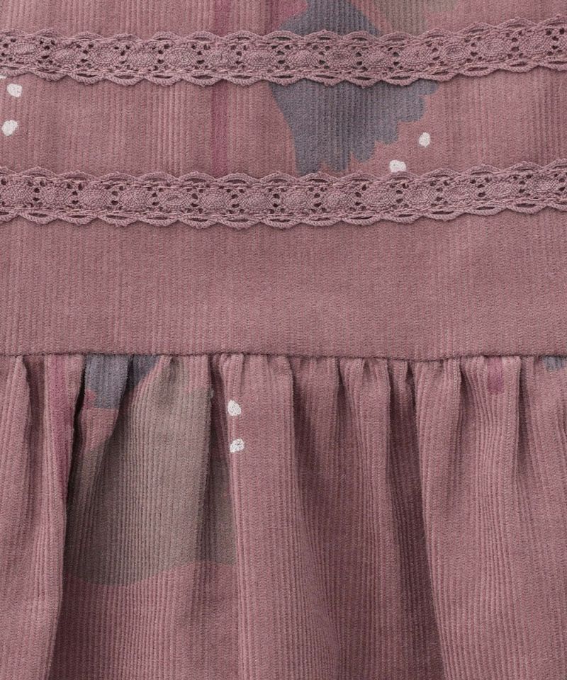 細畝の目面が綺麗なコーデュロイ素材に、当時大人気だった柄をプリントしました。ベースを染めてから柄をプリントすることで綺麗な発色に仕上げています。ふんわりとしたパフスリーブと胸元からふんわりとひろがるギャザーシルエットがかわいらしいデザインです。バストの高い位置で切り替えを入れることにより足長効果が期待できます。胸元に入れた3本ラインのレースがアクセント。冬に嬉しいフェイクファーベストがセットになったコーディネート要らずの便利アイテムですが、それぞれ手持ちのアイテムと組み合わせていただける着回しがきくアイテムです。日常使いに便利なご家庭でのお洗濯が可能なイージーケア商品です。