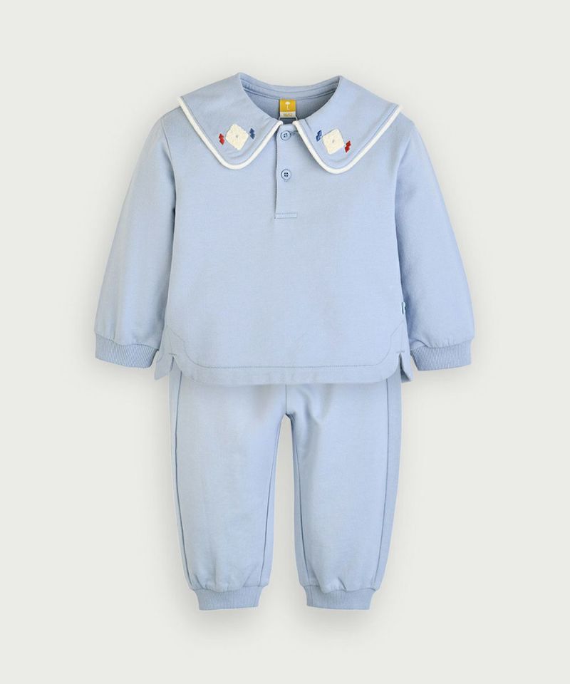 セーラーカラーの襟と刺繍デザインでシンプルながらもおしゃれを意識した長袖トップスとロング丈パンツのセットアップ。カラエブクル刺繍はモイモルンだけのパターンでユニークポイントとなっています。季節の変わり目に着やすい厚みのあるミニフレンチテリー生地のアイテムで、手首と足首はリップで処理され楽な着心地が感じられるアイテム