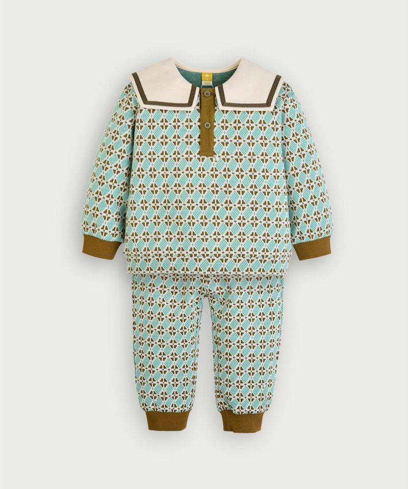 幾何学的なクローバー模様のジャカード生地を長袖トップスとロングパンツの両方に使ったセット。洗濯時にもシワが起こりにくい生地で、大きなセーラーカラーにある飾り付けテープがポイントのアイテム。ポイントでカーキでカラーを配色してワンランク上のおしゃれ感漂うデザインです。
