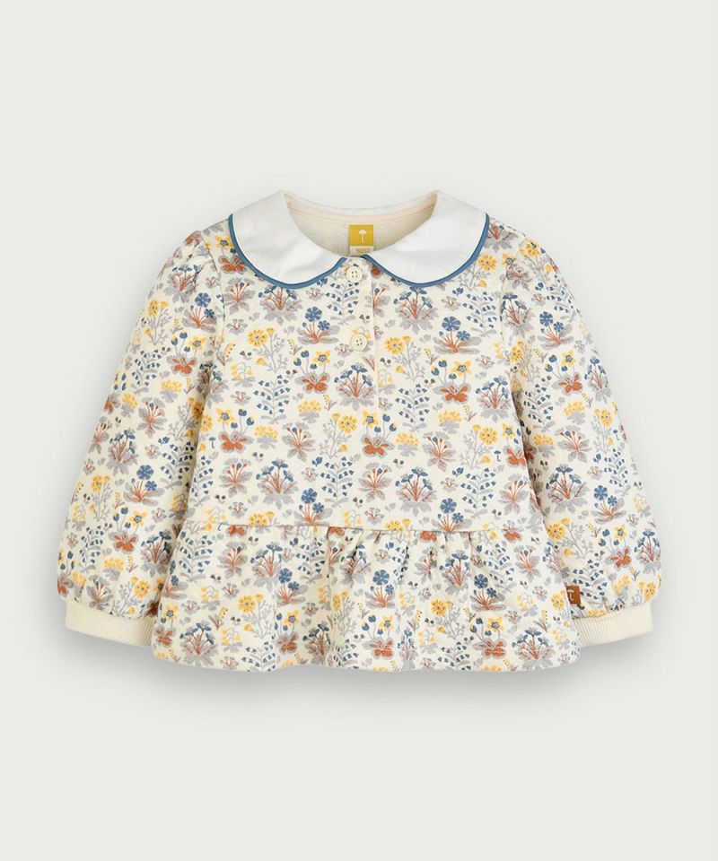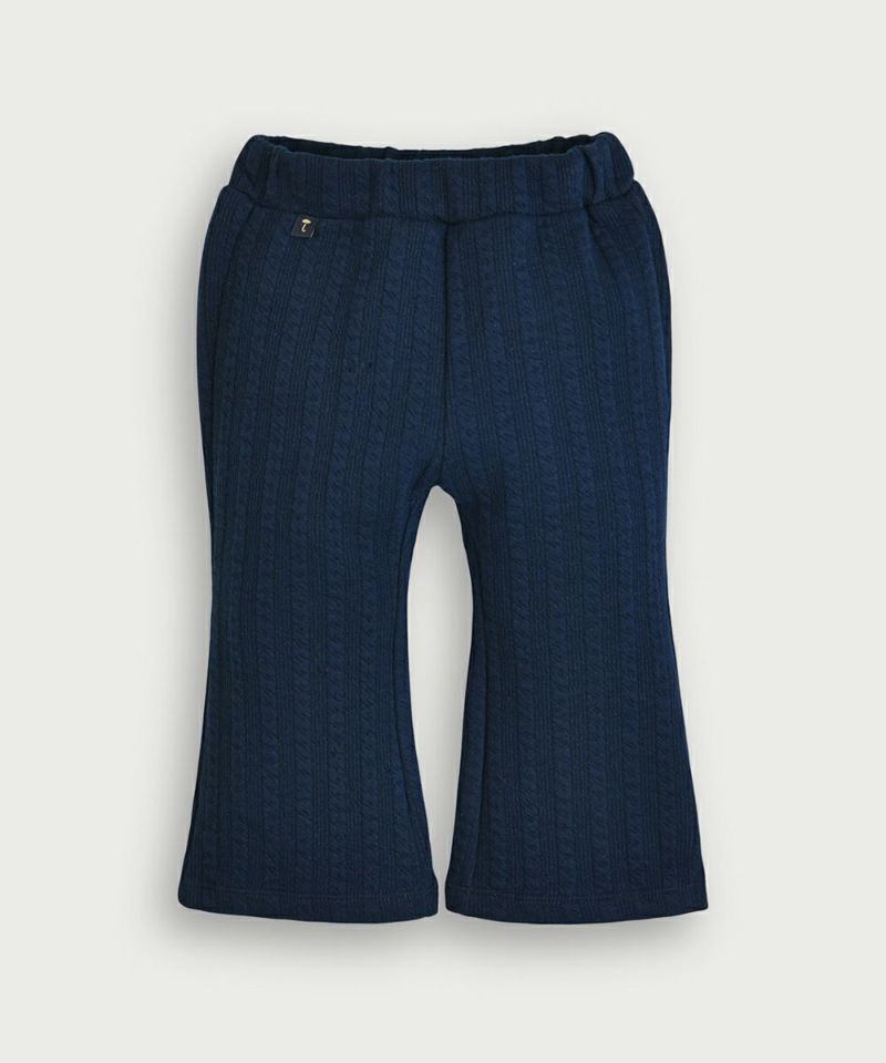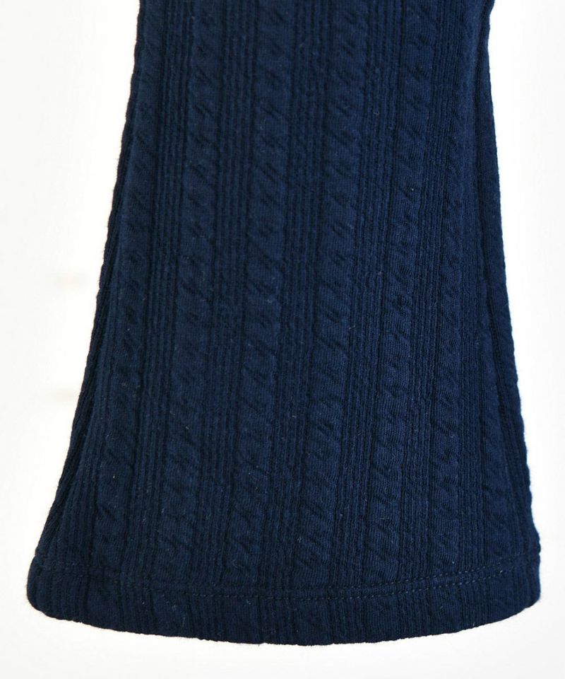アンティーク調のフラワーパターンの長袖トップスとロングパンツのセット。トップスは全体的にブルーのポイントとに色を合わせてまとまりがあり、フレアなラインが女の子らしさを更にアップ。、丸襟にはブルー配色を施しています。ボトムスは、ニット編み風なデザインのフレアロングパンツで、ゴム入りなので脱着も楽におこなえます。