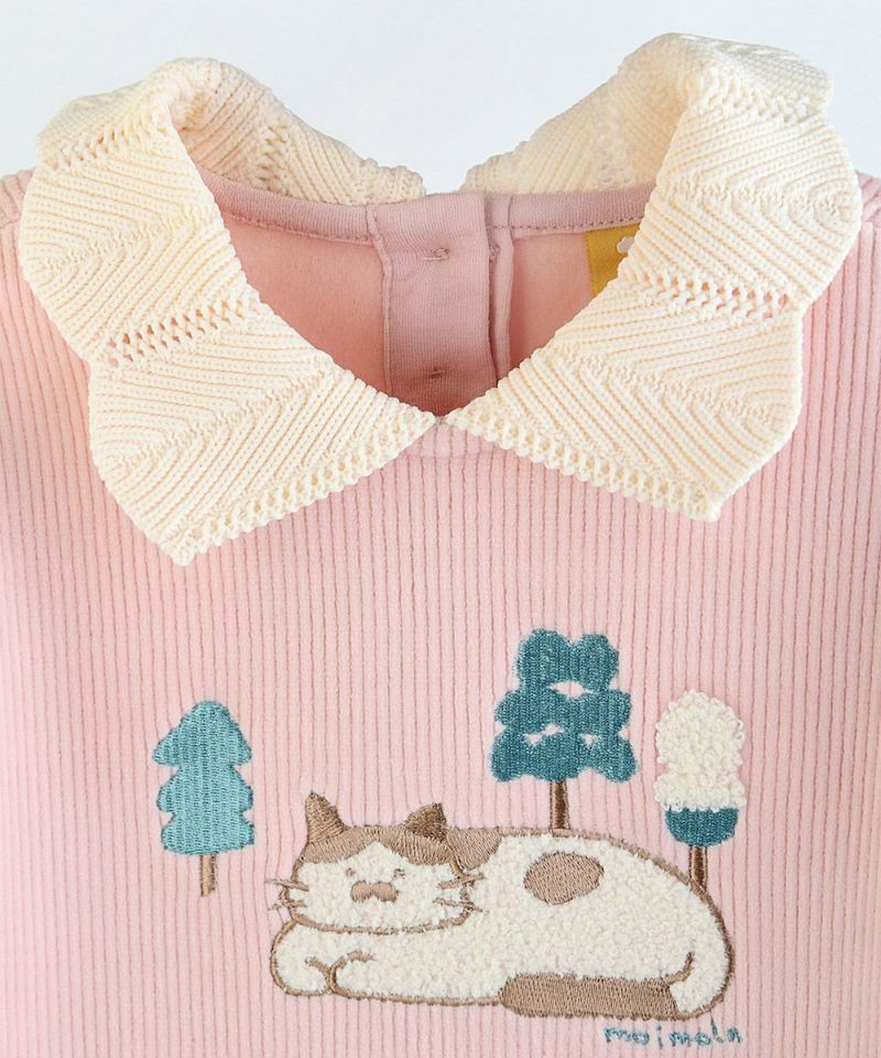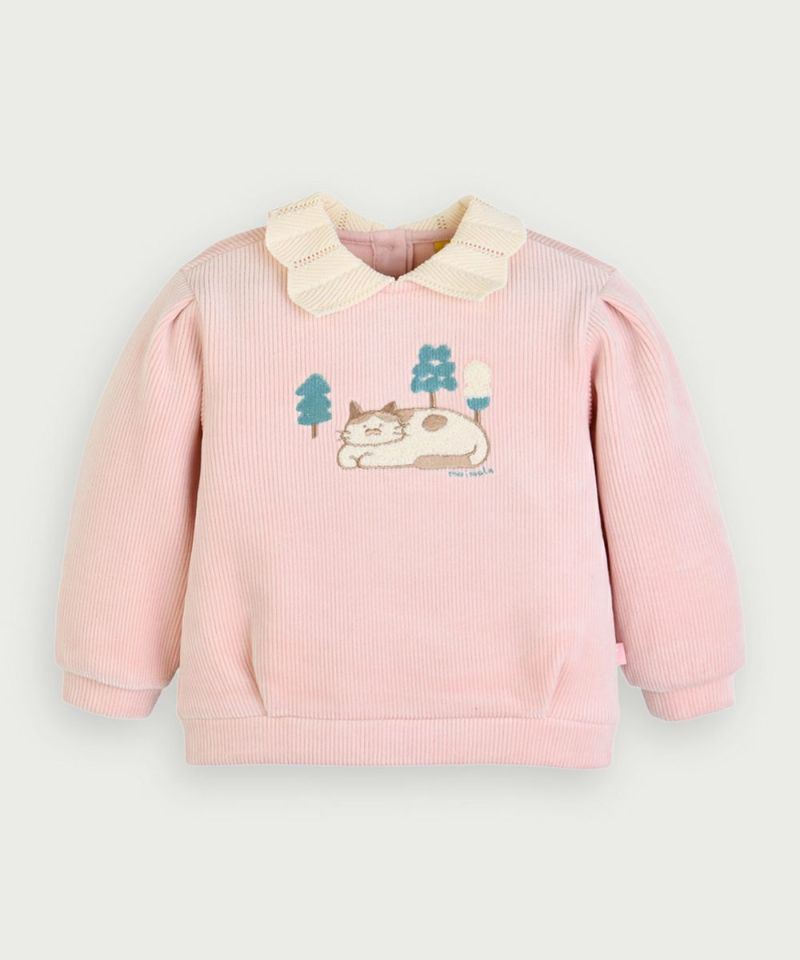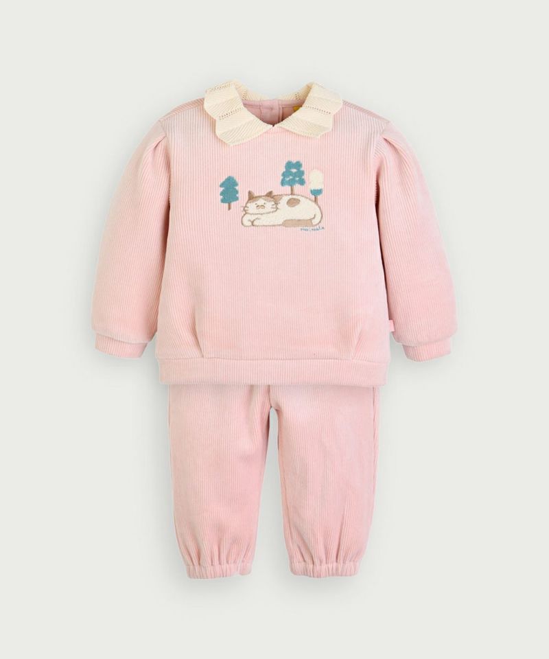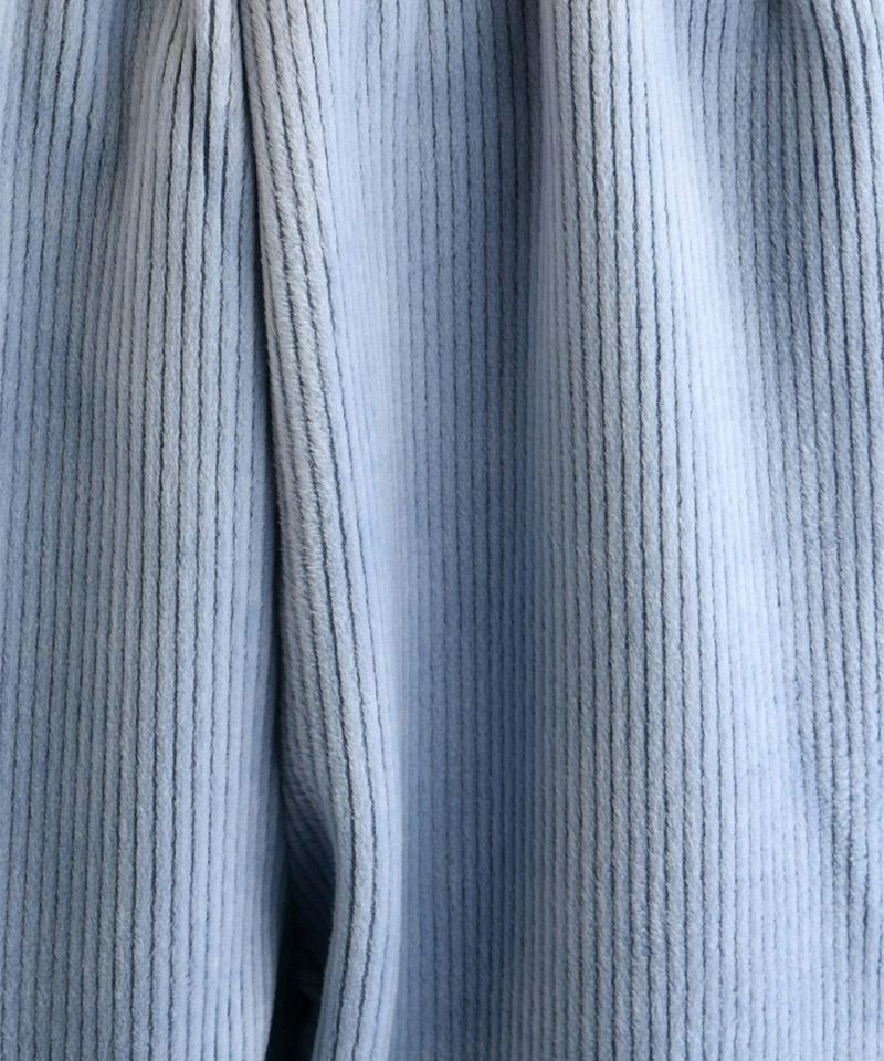 フロントの可愛いネコのミャオ(meow)刺繍がポイントの長袖トップスとロングパンツのセット。長袖トップスはネコ以外に木々もプラスされ、コーデュロイ生地が季節感にぴったり、襟は編み上げレースのようで異素材MIX感がおしゃれポイント。ボトムスはカラーコーデュロイのロングパンツで、セットアップとして以外にも、他のアイテムとのコーデの相性もばっちりです