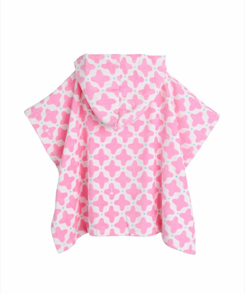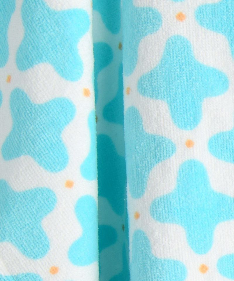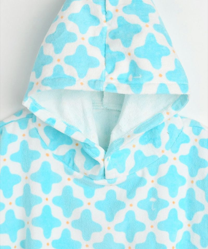 ダイヤモチーフ柄が特徴で、スナップで留められるため着脱しやすい綿タオル素材のフード付きポンチョ。水遊びや入浴後などの水を拭く際に使い勝手の良いアイテムです。# 細部サイズ : 横幅_約68cm / 縦丈 (サイドネック点)_約50cm