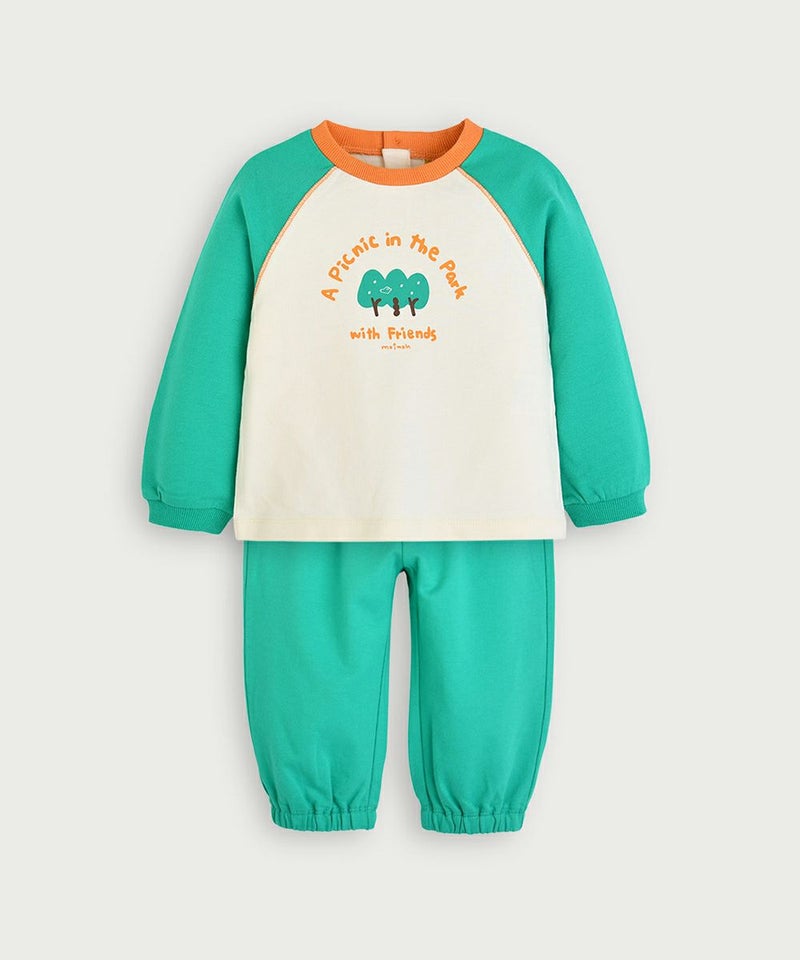 ラグラン袖のプリント長袖トップスとパンツのセット。