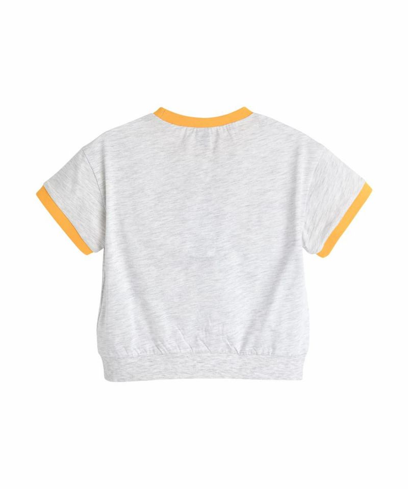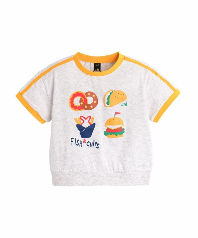 フードメニュープリントが可愛いTシャツ。 ネックと肩のラインがつながっているイエローのバイカラーがポイント♪POPで可愛いコーデが完成します。