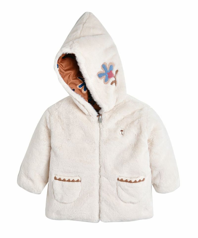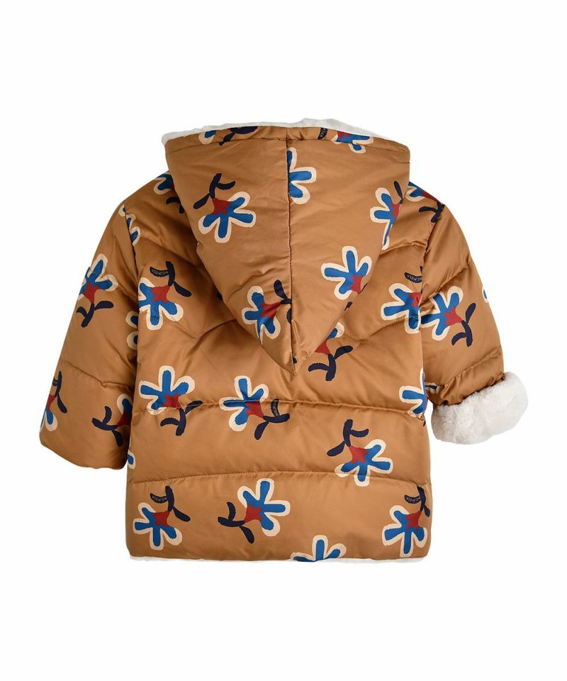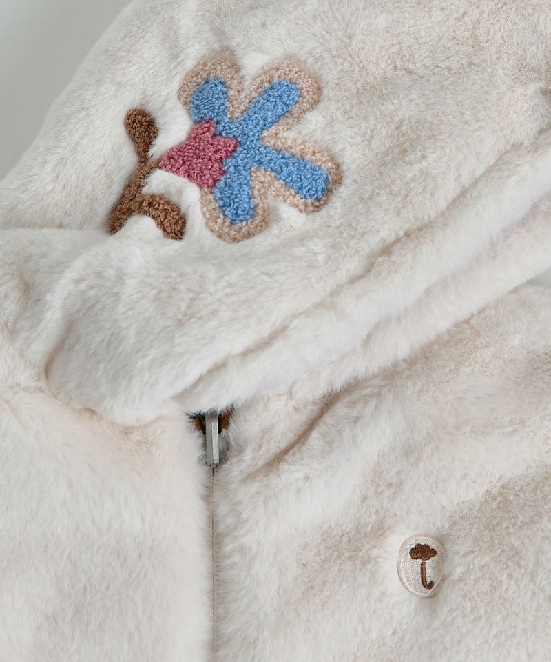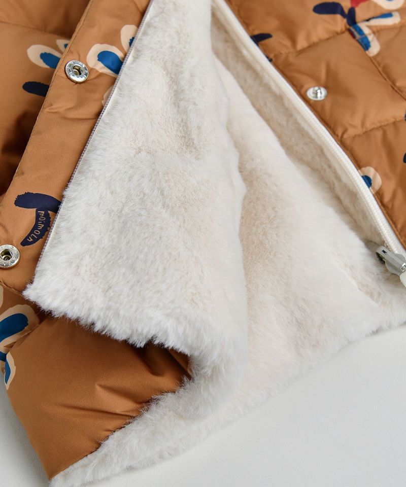 大きな花柄とやわらかく保温性のある生地を使用したリバーシブルダウン。フードのフラワー刺繍とポケットのユニークな刺繍がポイントのアイテムです。
