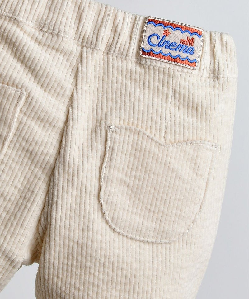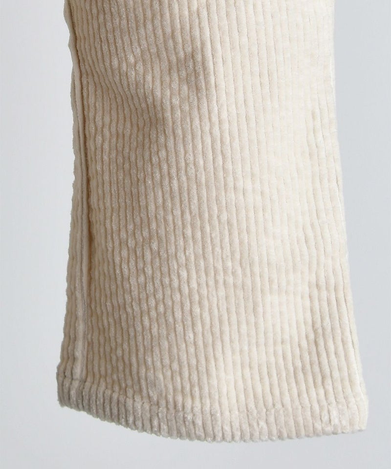 柔らかいコーデュロイ素材にセミベルボトムラインのパンツ。伸縮性の良い素材とソフトなクリームカラーで様々なスタイリングが可能なアイテムです。
