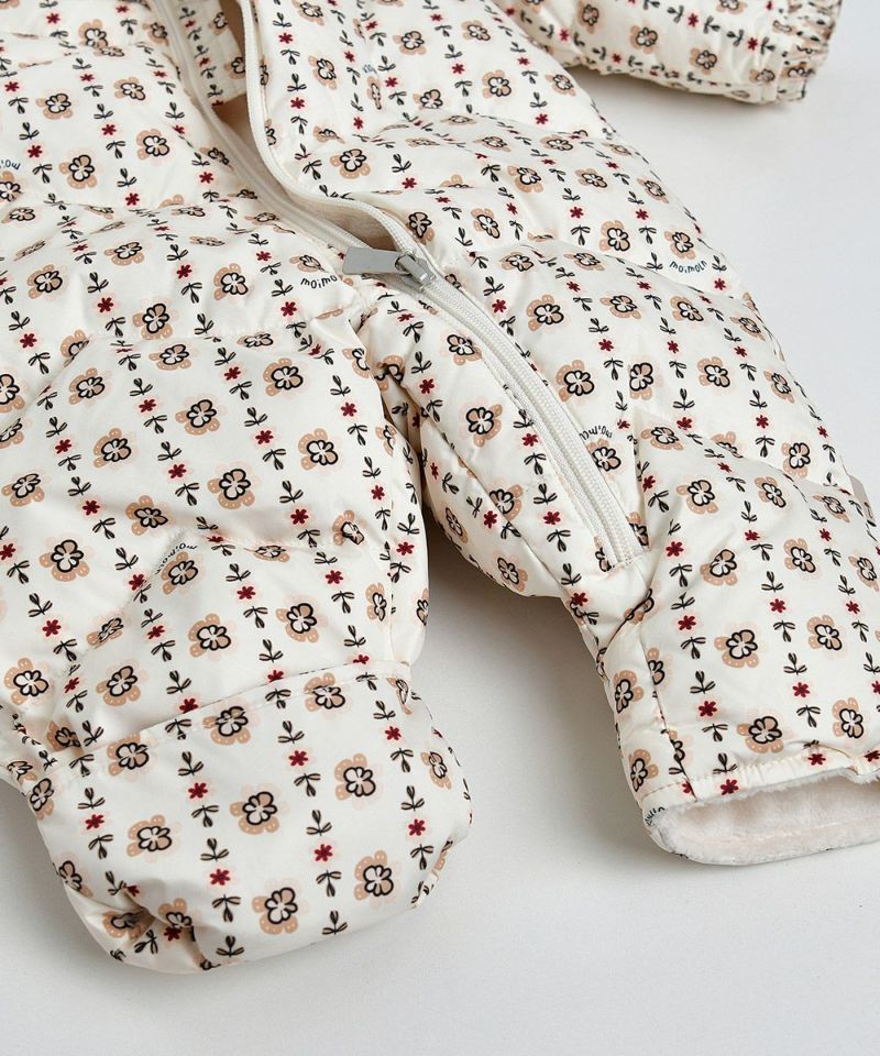 ユニークなフラワー柄と柔らかいファー配色がポイントのカバーオール。きれいめカラーでコーデが明るく見え、グースダウンの中綿で高級感もあり軽いアイテム。裏地をベルボアにし保温性にもこだわりました。