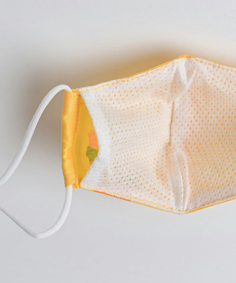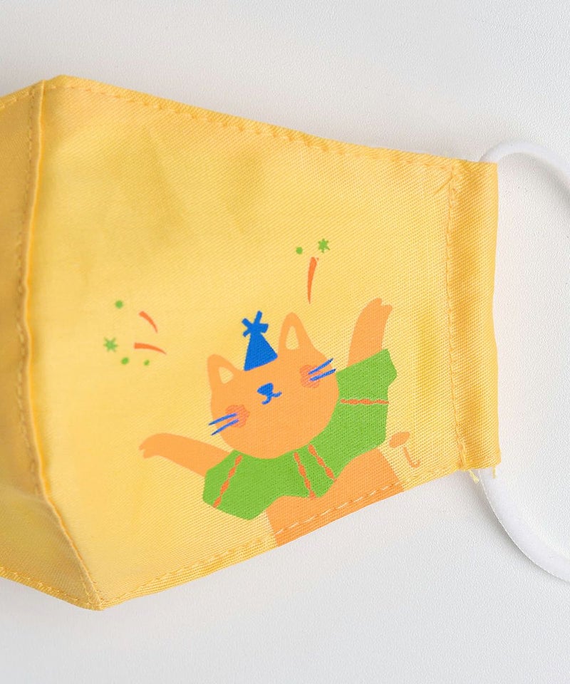 フィルター交換型立体マスク。ソフトなイエローカラーにかわいいキャットプリントがポイント♪表地と裏地の間にフィルターを入れられるように切り込みが入っていて、マスクの紐にストッパーが付いているので、顔に合わせてサイズ調整できる実用的なアイテム。小さなお子様にも実用的で、裏面に抗菌加工をした衛生的で安心してご使用いただけます。