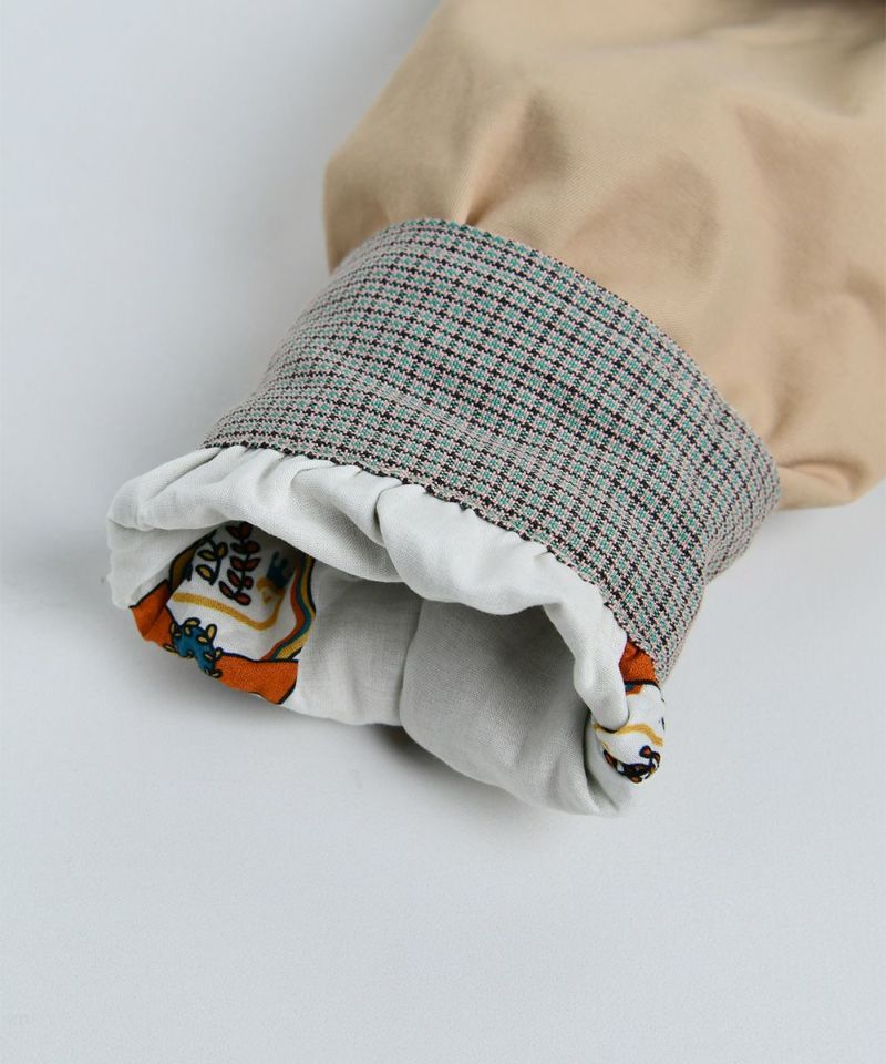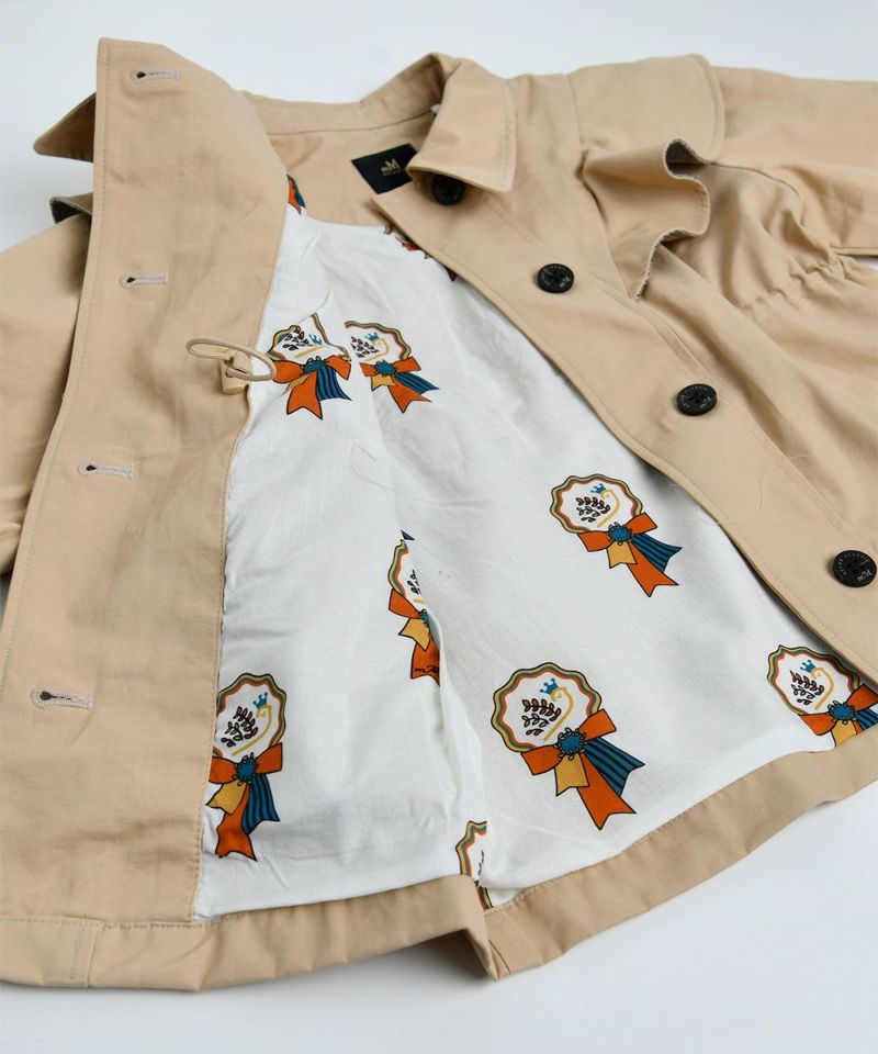 やわらかな肩のフレアフリルとウエストの絞りがポイントのハーフ丈トレンチコート。コーディネートしやすいベージュカラーにチェック生地をプラスしているため、クラシックなスタイリングが可能なアイテムです。