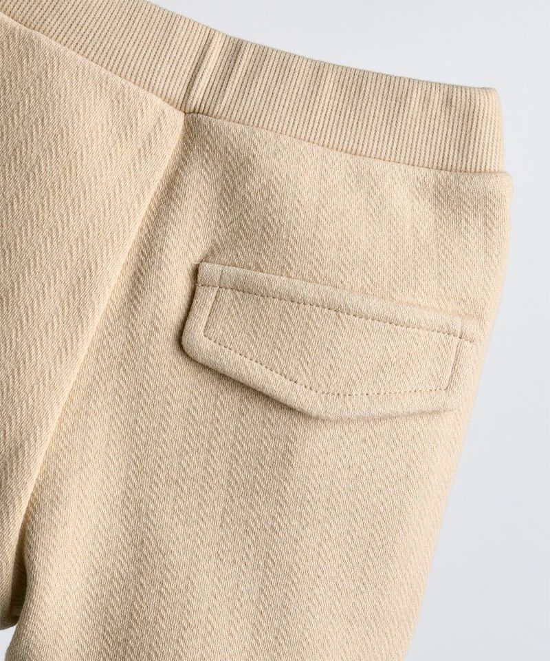 高級感溢れるヘリンボーンジャカード素材のベルボトムラインパンツ。伸縮性があるため履きやすく、裾のフレアで女の子らしさを演出。両ポケットのおしゃれなシーズングラフィック刺繍がポイントのアイテムです。