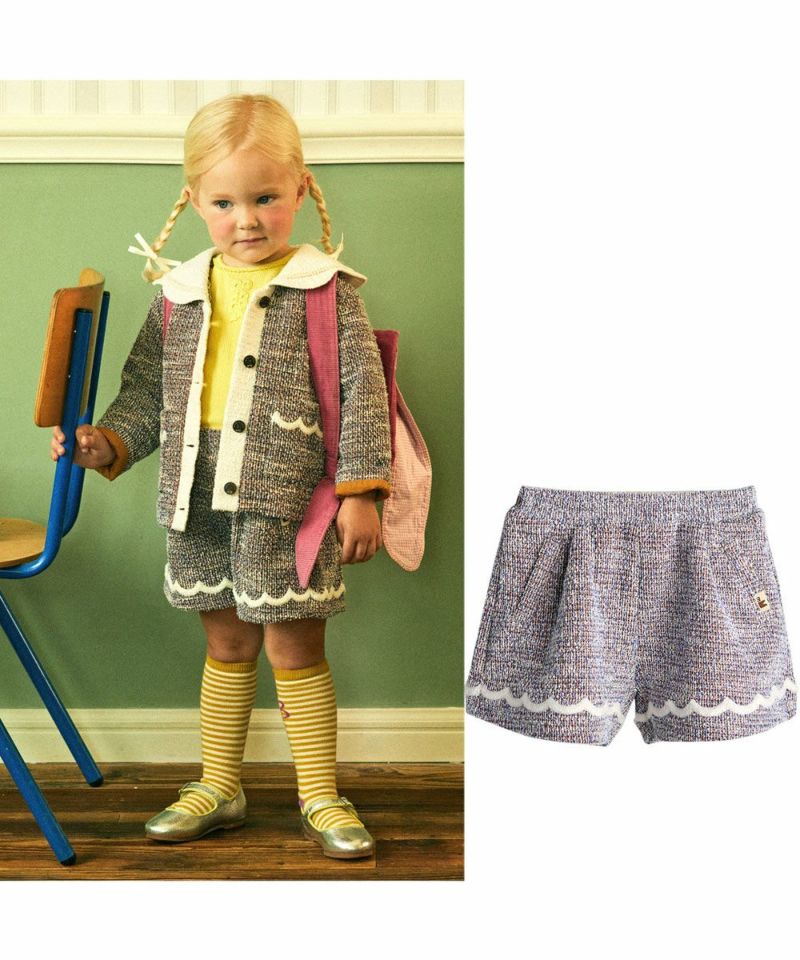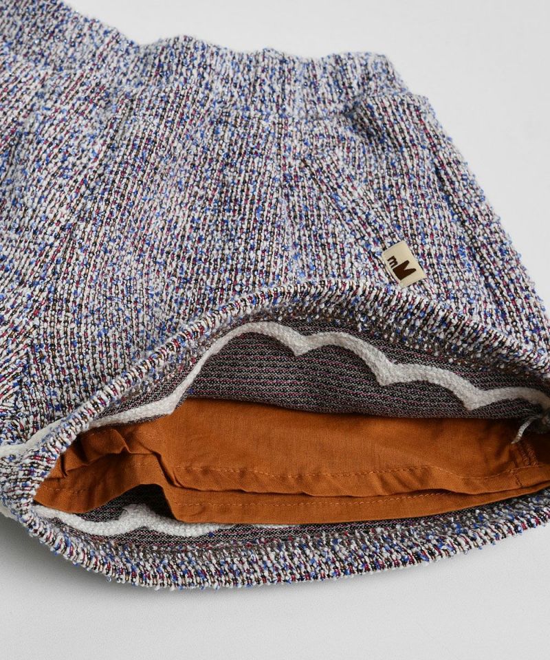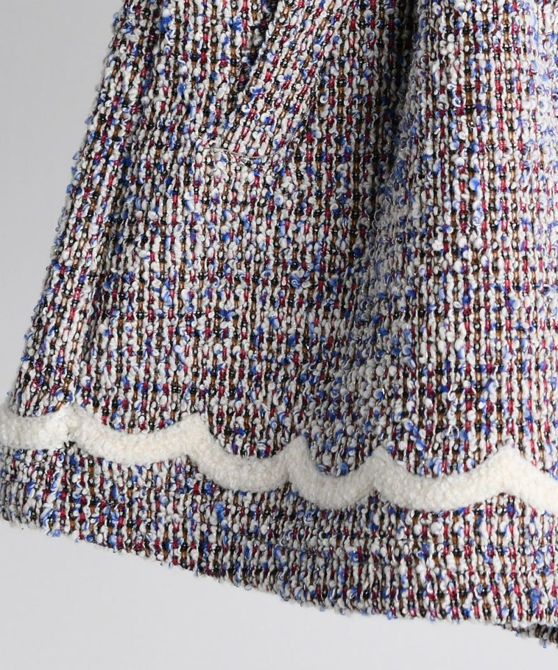 ツイードジャカード素材とスカラップ刺繍が高級なAラインフィットのツイードパンツ。膝上丈で、メリエルウェーブツイードジャケット(W241JKG25P)とのセットアップコーデがおすすめです。