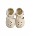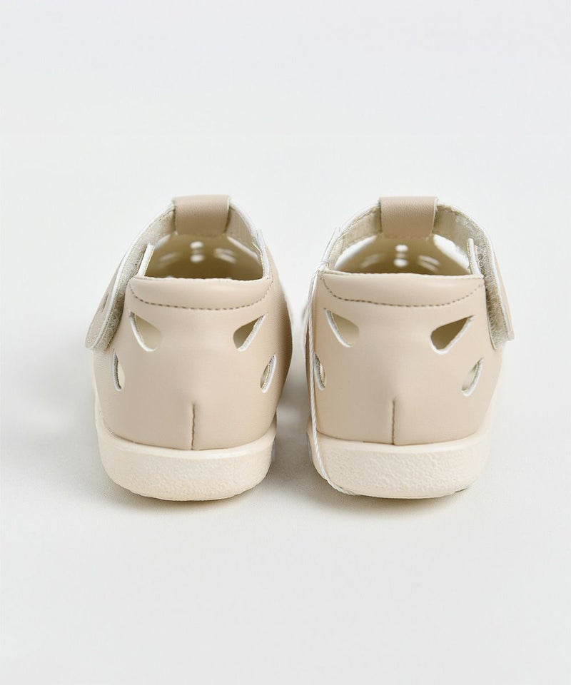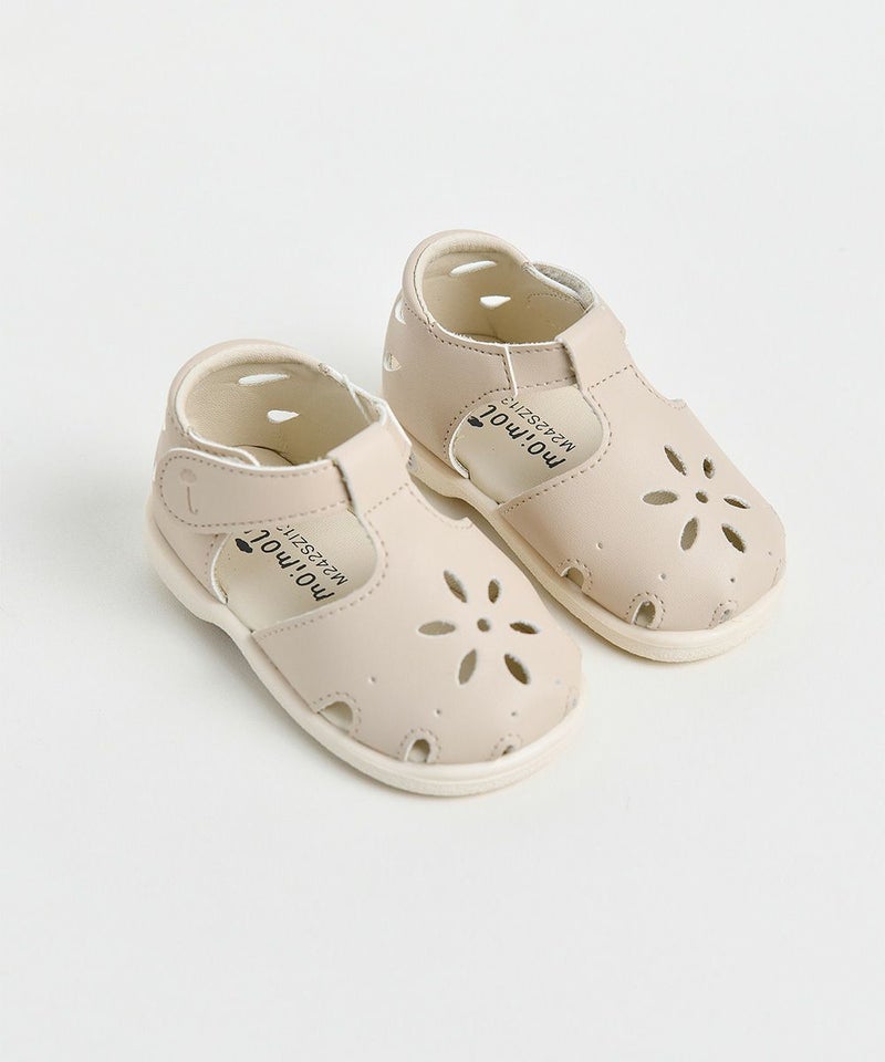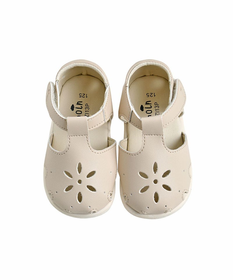 花モチーフのパンチングディテールがポイントのサンダルメロディシューズ。サンダルながらつま先が空いていないため、足をしっかり支えてくれるので歩きやすいアイテム。落ち着いたベージュトーンでムードのあるコーディネートがが演出できます。