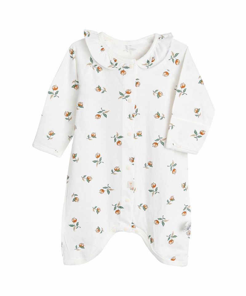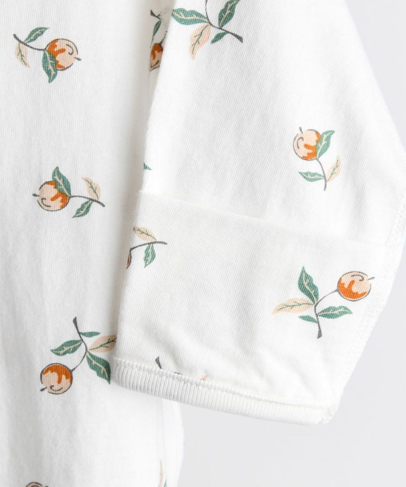 フリル付きの女の子らしい花の実がモチーフの肌着。ベビーギフトにも喜ばれるアイテムです。